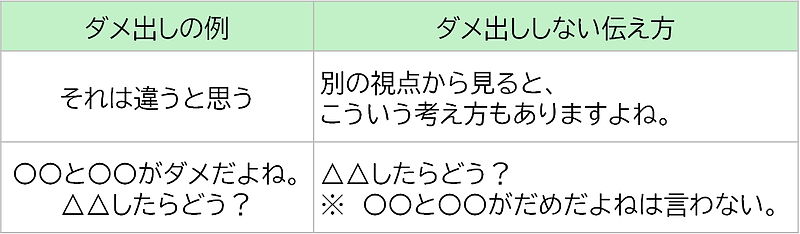相手の意見や感情を否定せず、そのまま受け止めます。批判的な態度は、相手の話を妨げてしまいます。例えば、以下のようにダメ出しせずに伝える方法があります