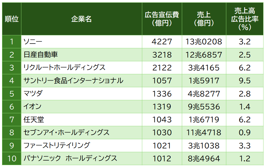 2023年9月期から2024年8月期までのデータを基にしたランキングでは、ソニーグループが1位となり、広告宣伝費は4227億円に達しています。