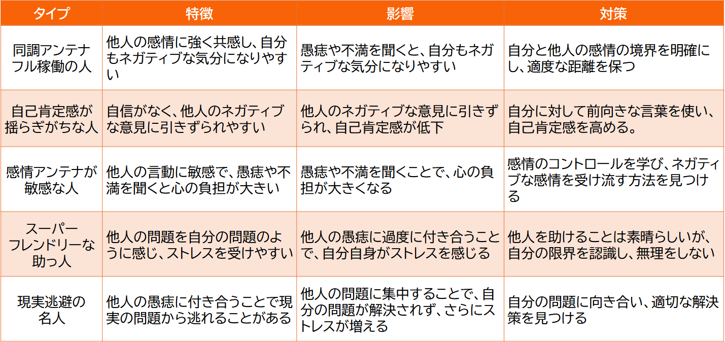 これらのポイントを踏まえ、愚痴や不満に影響を受けやすい性格タイプや付き合うべきではない行動や状況について学び、自分を守るための対策を取りましょう。