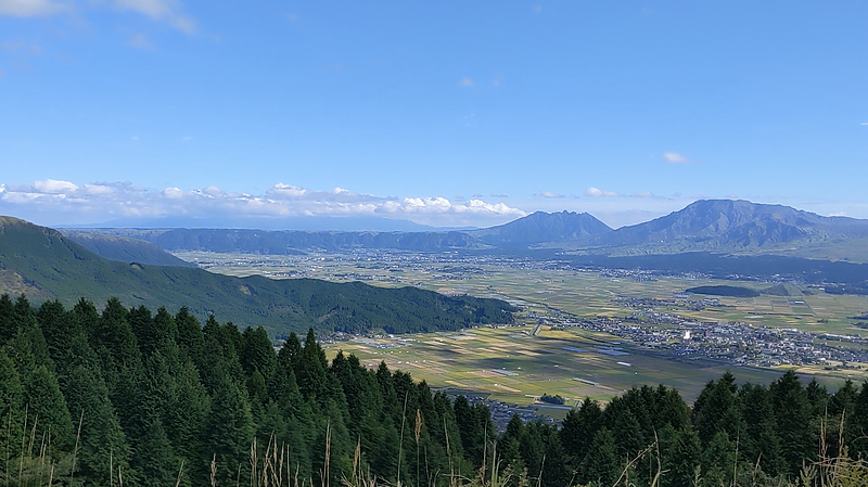 ツーリングの途中で休憩を取り、山の上から阿蘇の大地を見渡しました。