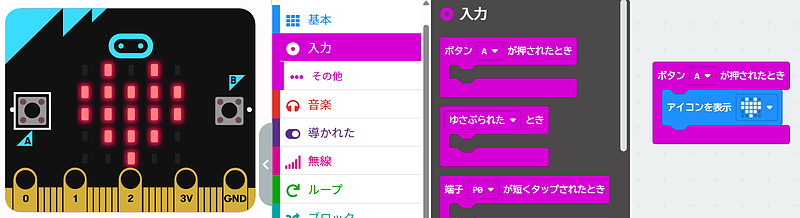 ・Aボタンを押すと、ハートが光るプログラムを作る。