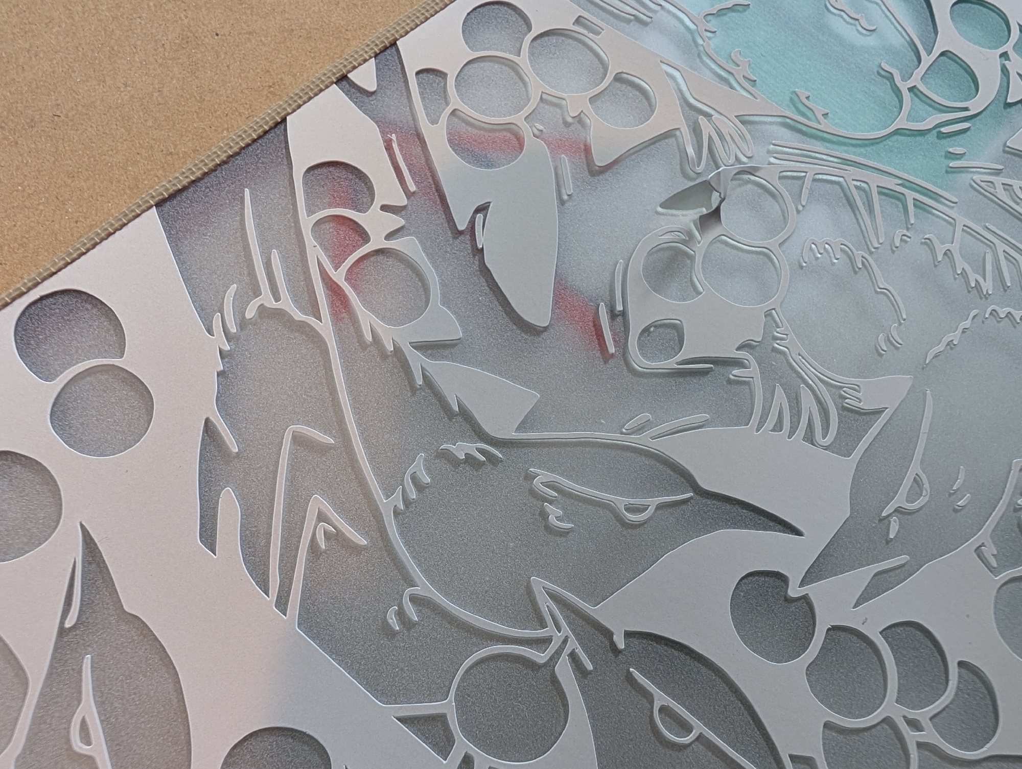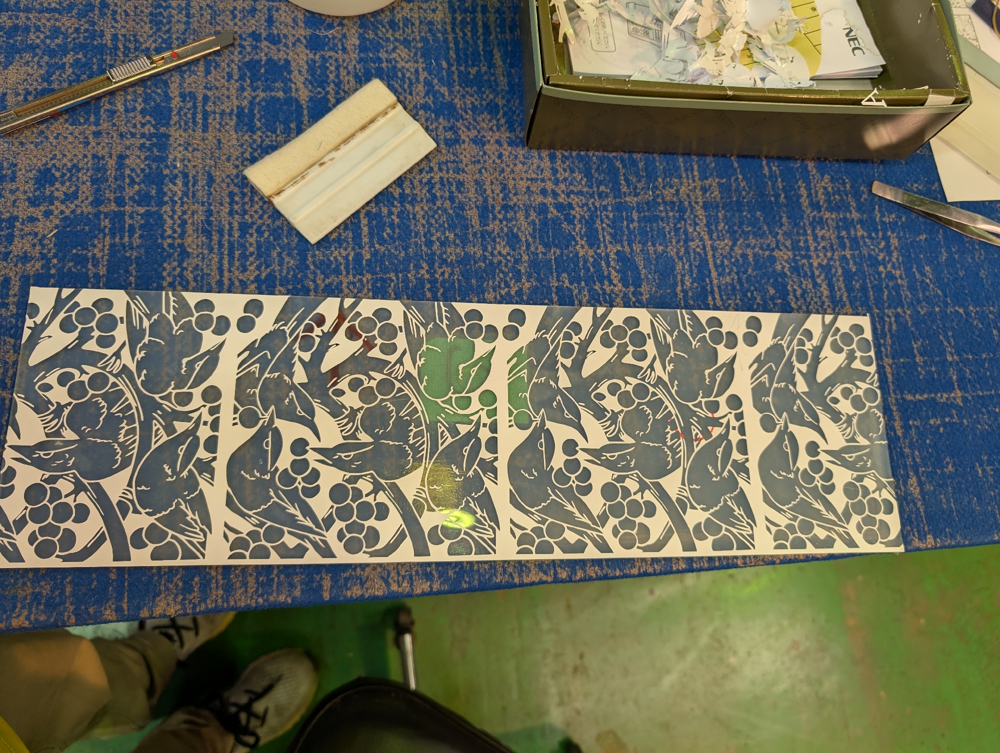 デザイン段階では、まず小鳥のモチーフを考え出し、それをエッチング用のカッティングシートとして切り出す準備を進めました。