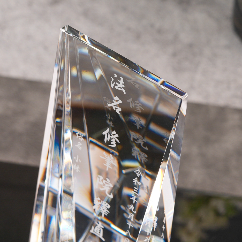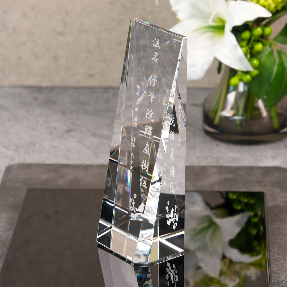 ガラス位牌は、従来の木製位牌とは異なり、その透明感や光の反射によって、美しい表情を見せるのが特徴です。