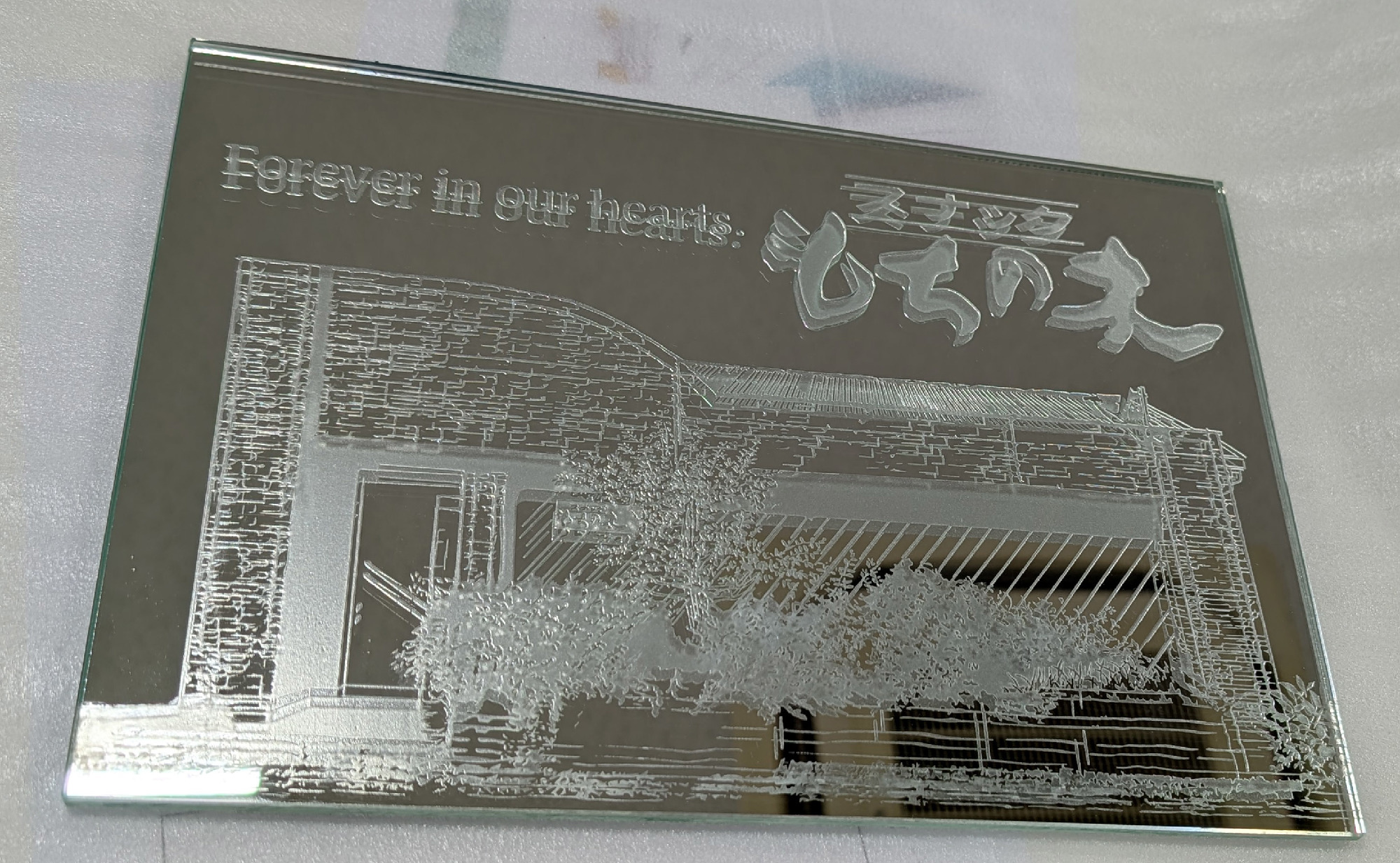 その節目に、「記念として何か形に残したい」というご依頼をいただき、鏡への彫刻というかたちでお手伝いさせていただきました。