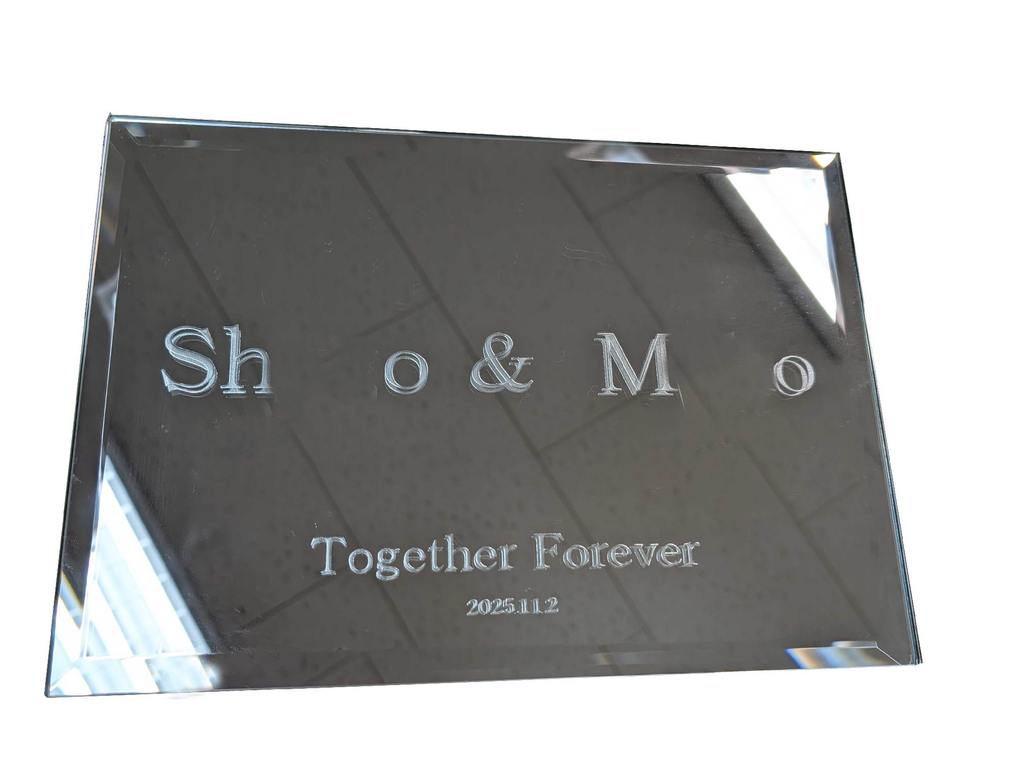鏡の表面に、新郎新婦のお名前と結婚式の日付を丁寧に彫刻。