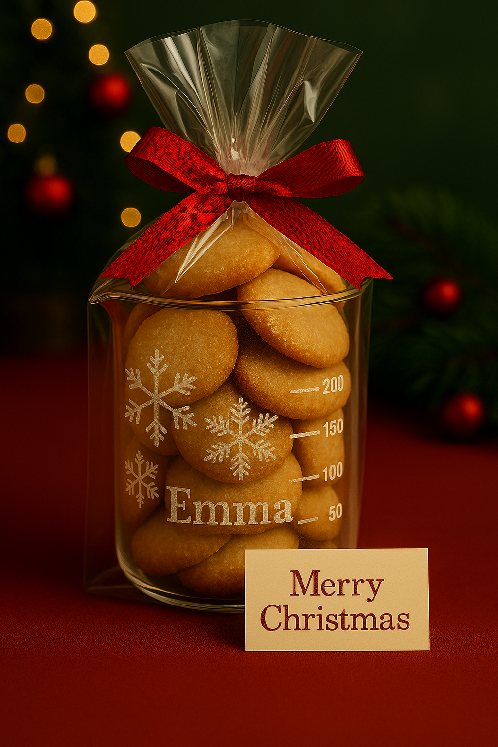 ビーカーにお名前やメッセージをサンドブラストで刻印できます。