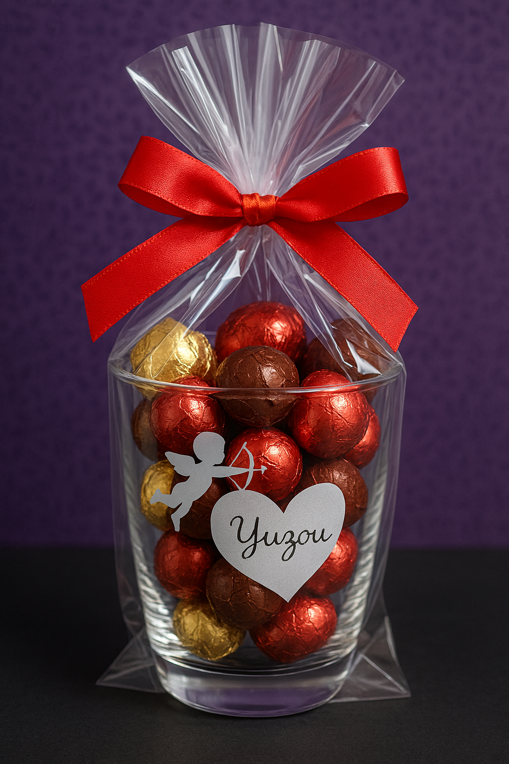 写真のように、名前入りのグラスにチョコレートを詰めてラッピングすれば、世界にひとつだけのギフトが完成します。