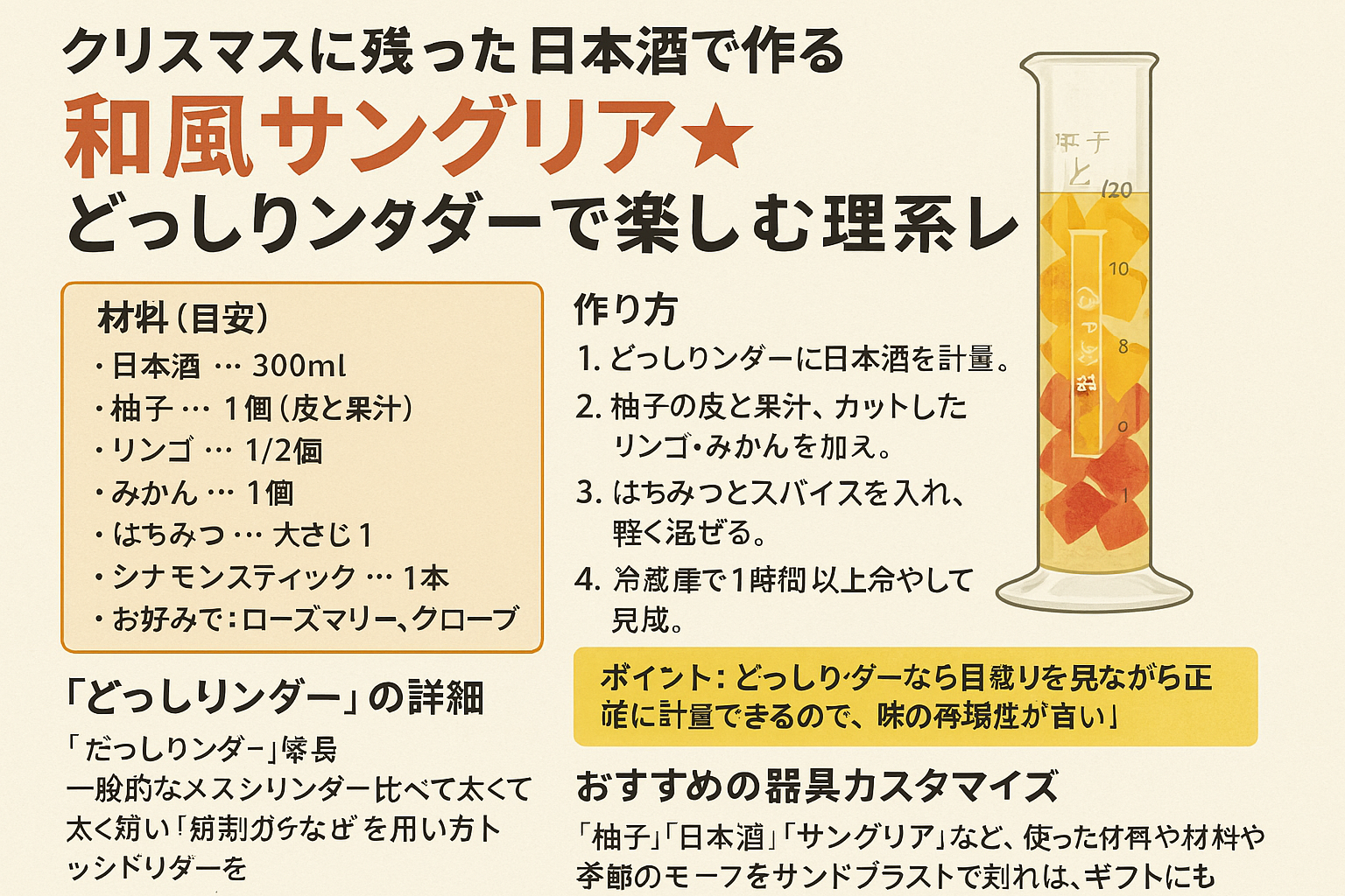 クリスマスに開けた日本酒が少し残っている、正月用に買った柚子が余ってしまった――そんなときにおすすめなのが、和風サングリア。どっしりンダーを使えば、目盛りを見ながら計量できるので、味の再現性も抜群です。さらに、使った材料をサンドブラストで刻んだオリジナル器具を使えば、特別感もアップ!
