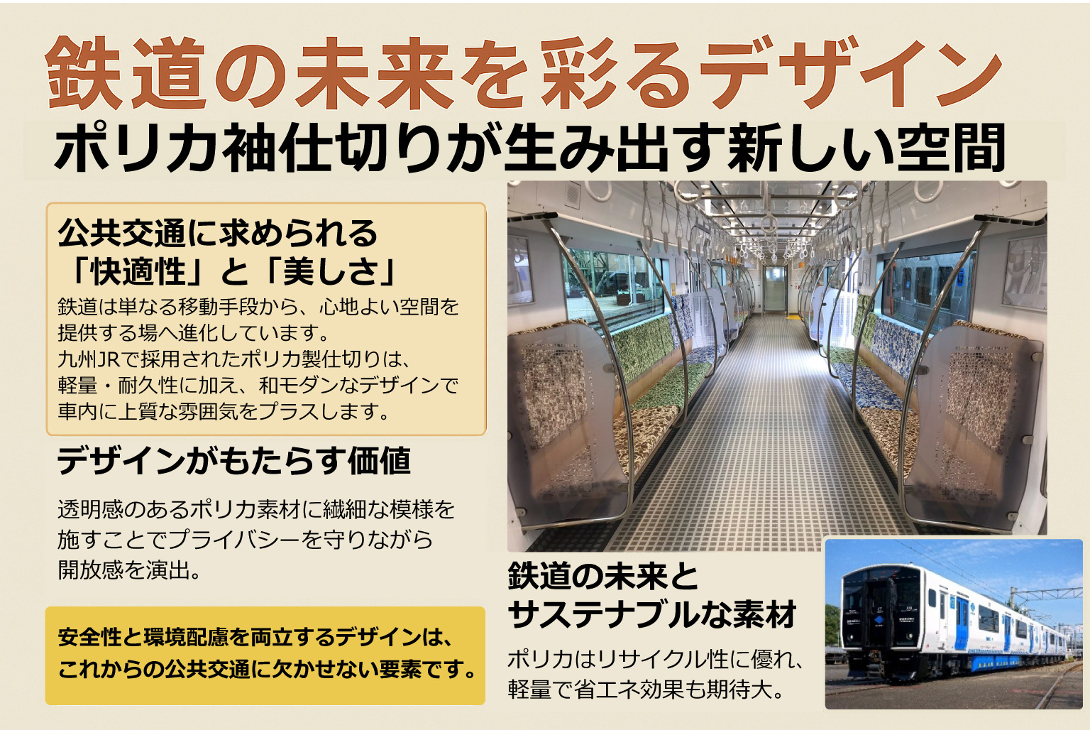 九州JRで採用されたポリカ製仕切りは、軽量・耐久性に加え、和モダンなデザインで車内に上質な雰囲気をプラスします。