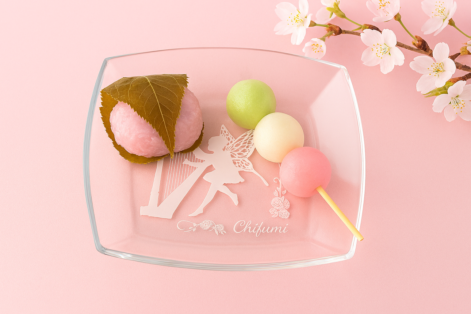 ・三色団子や桜餅などの淡い色が、ガラスに反射してより可愛らしく見える