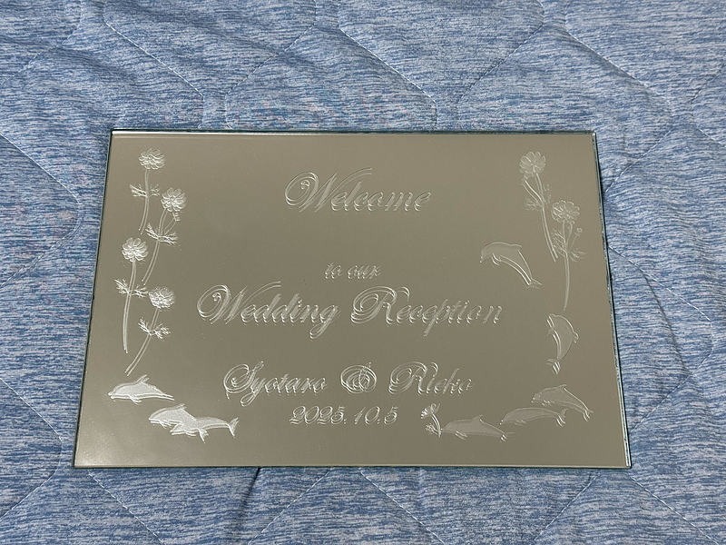 10月に結婚式予定で、ウェルカムボードが欲しいなと思ってた時に松岡さんが今まで作ってある数々な素敵なウェルカムボードを見て是非お願いしたいなと思い、制作お願いしました!デザインが沢山あって迷ったのですが、私の好きなイルカがデザインされてあるウェルカムボードをお手本に挙式が10月で秋なので、イルカと秋を感じる物をとお花も好きなのでコスモス(秋桜)と、式が終わった後も普段使い出来るように背景鏡にとお願いしました。そしたらめっちゃ素敵で可愛いウェルカムボードデザインを作って頂き、実物を頂いて間近に見た時は素敵過ぎてず~と眺めてました!(全体的に好きですが、イルカが秋桜をちょこんとつついてる所がお気に入りです。)まだ挙式前ですが、式場のウェルカムスペースに飾るのが楽しみです。他の皆さんにもおすすめしたい、本当に素敵すぎる希望のウェルカムボードを作って頂きありがとうございました!また機会がありましたらよろしくお願いします。