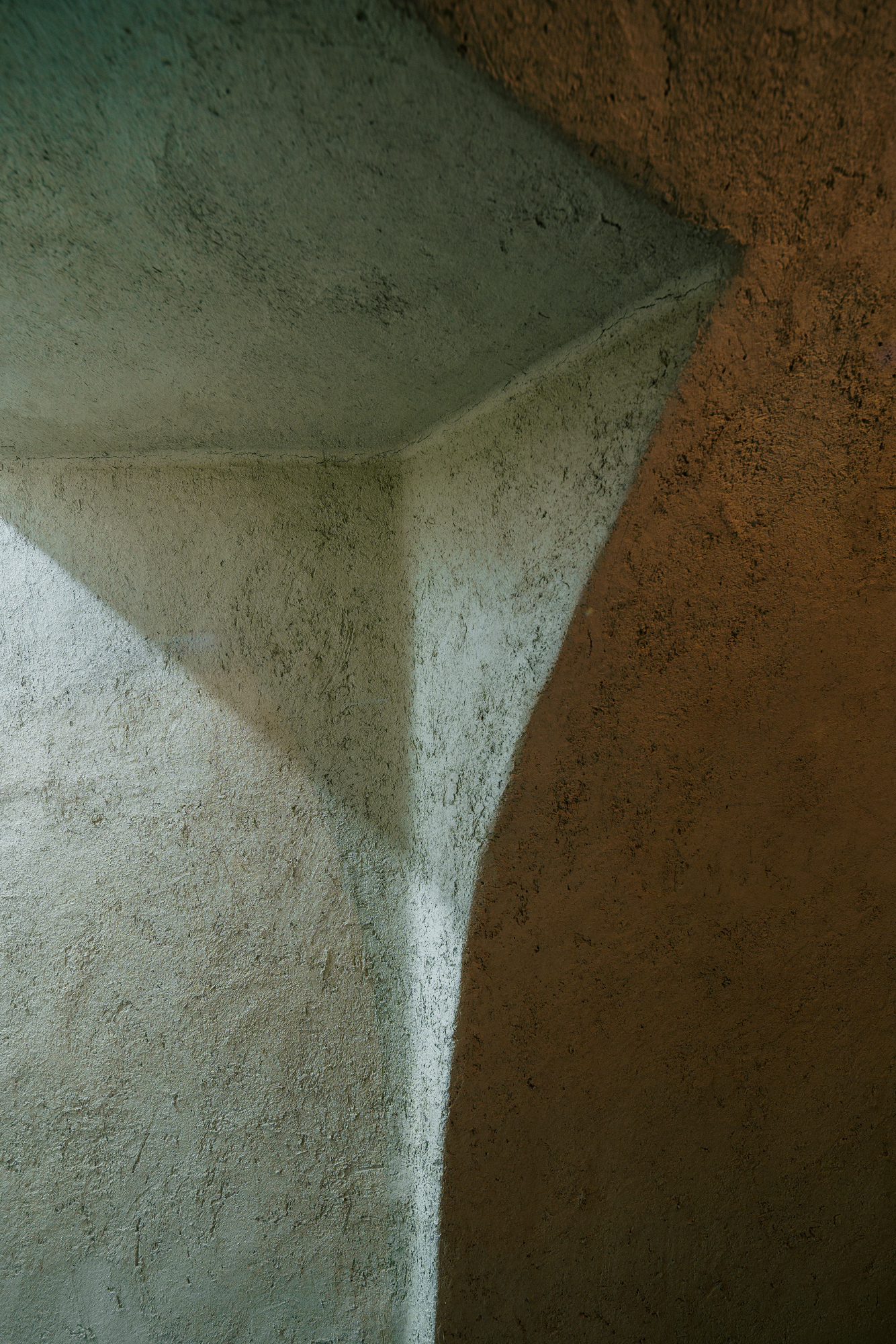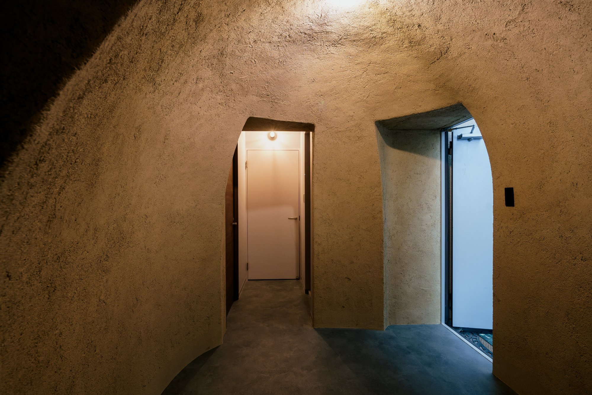 土は本来、屋根や壁に必要な建築材料として立派な役目を果たしていた。しかし現代においては、安く早く現場を完成させるための新建材が誕生したため、建設現場で土を見かけることもなくなった。 化学物質を含まない土は人体に優しく、再利用可能で環境負荷も少ない。更に調湿性、断熱性、防音性、防火性などにすぐれた自然素材である。 そこで今回は土の良さを再認識する第一歩として、オフィスのエントランスに洞窟のような土壁空間を挿入した。 豊かな空間や自然を感じる空間を創造するための試行錯誤は続くが、土を使うことが一つの答えになり得るのではないだろうか。