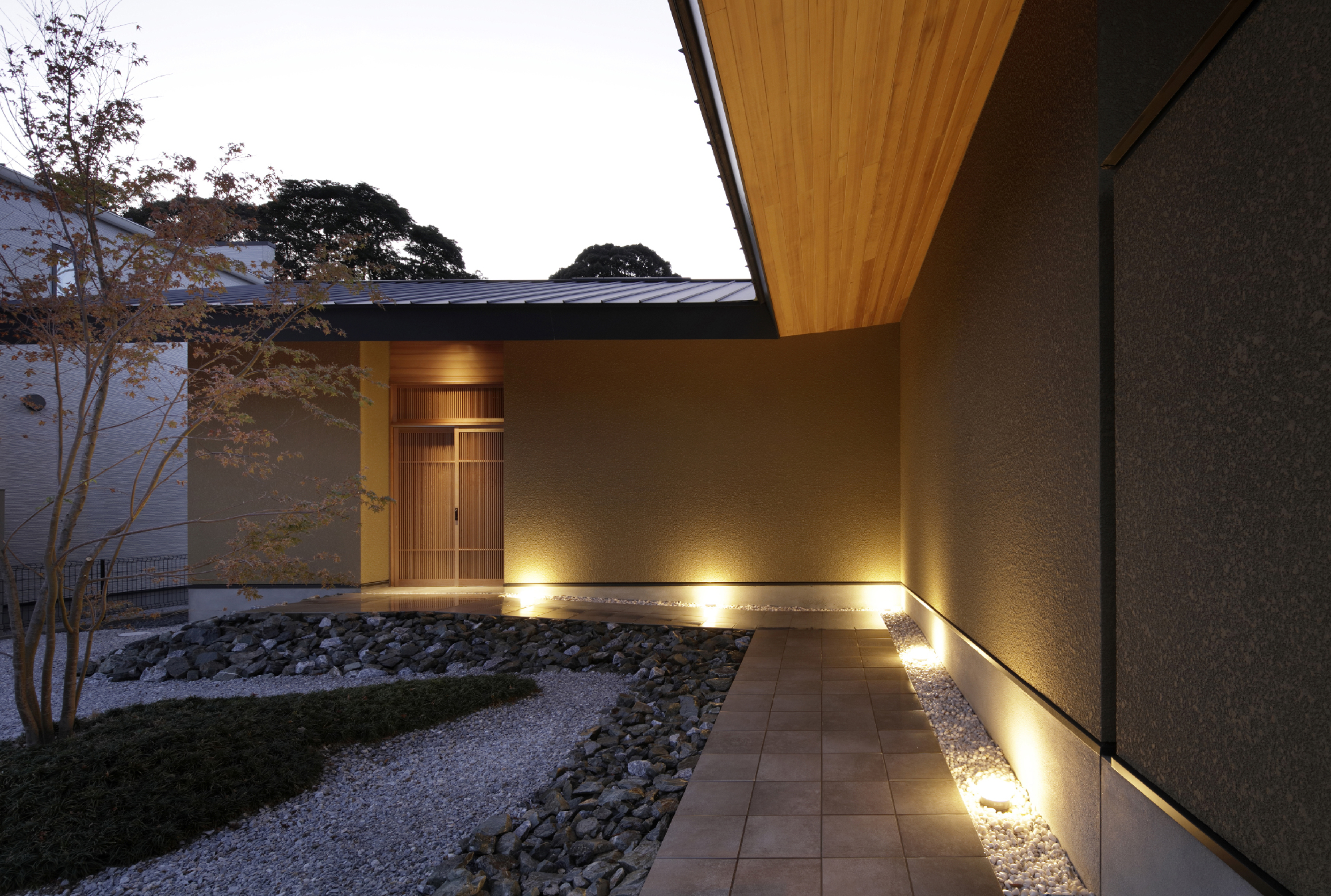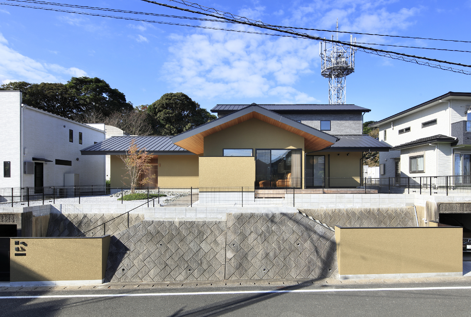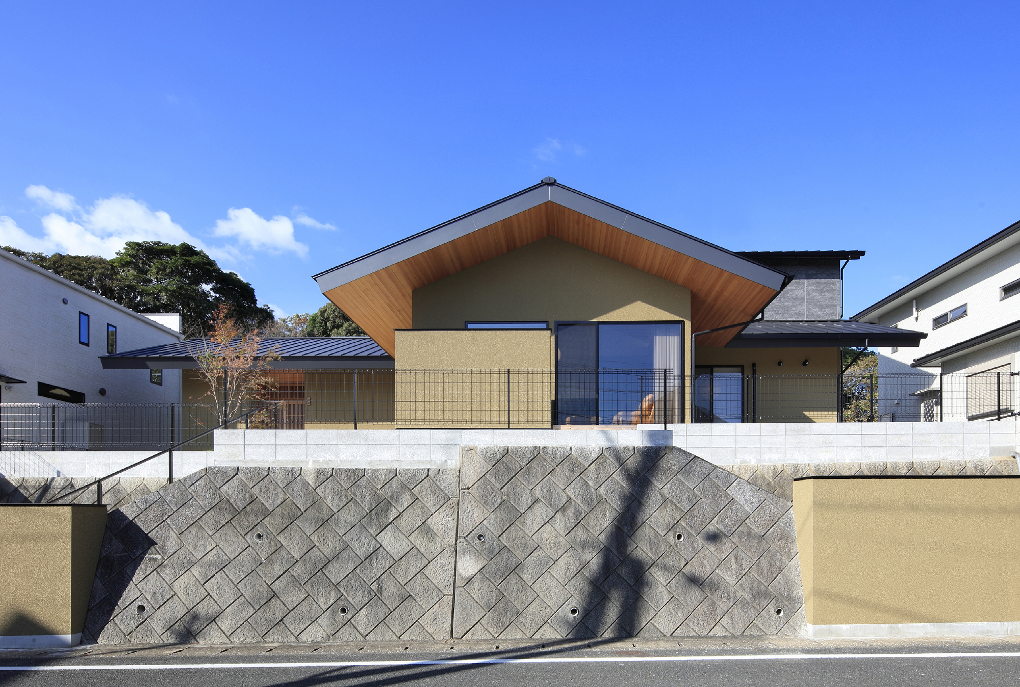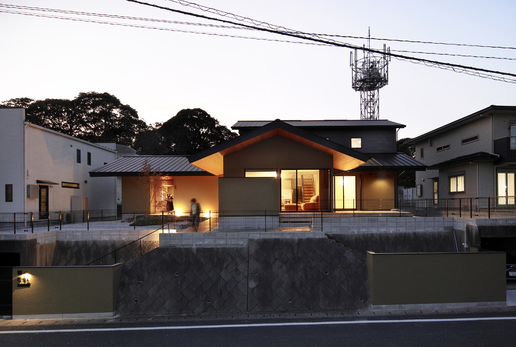 20年前に建てた自宅が手狭になったご夫婦と成人した娘3人のための2軒目の住まいである。 敷地は1軒目の家から徒歩30秒ほどの閑静な住宅街で、道路より3メートル高い位置にある。 子育てを終えたご夫婦に、これからはゆとりある時間を過ごしてほしいと感じた。 外観はご主人の要望である「大きな屋根」を持つ、どっしりとした平屋をイメージ。 道路からは2階の存在を感じさせないよう軒を1.5メートル出し、落ち着いた佇まいとした。 玄関は敷地の奥に配置し、約20メートルのアプローチを設けた。 車を降り、庭のもみじを眺めながら軒下を歩く時間が心を整える。 玄関ポーチには木製格子戸を設け、その奥にアルミ製ドアを配置。 完成後は離れて暮らす娘さんたちも週末に帰省し、再びリビングに家族の笑顔が集まっている。 (392文字)