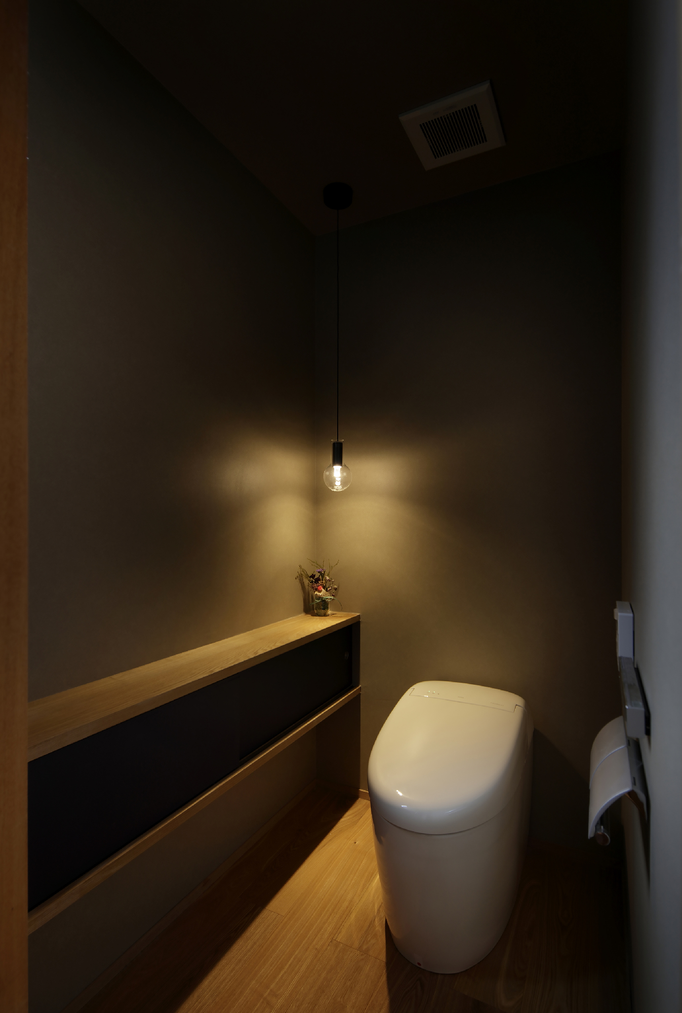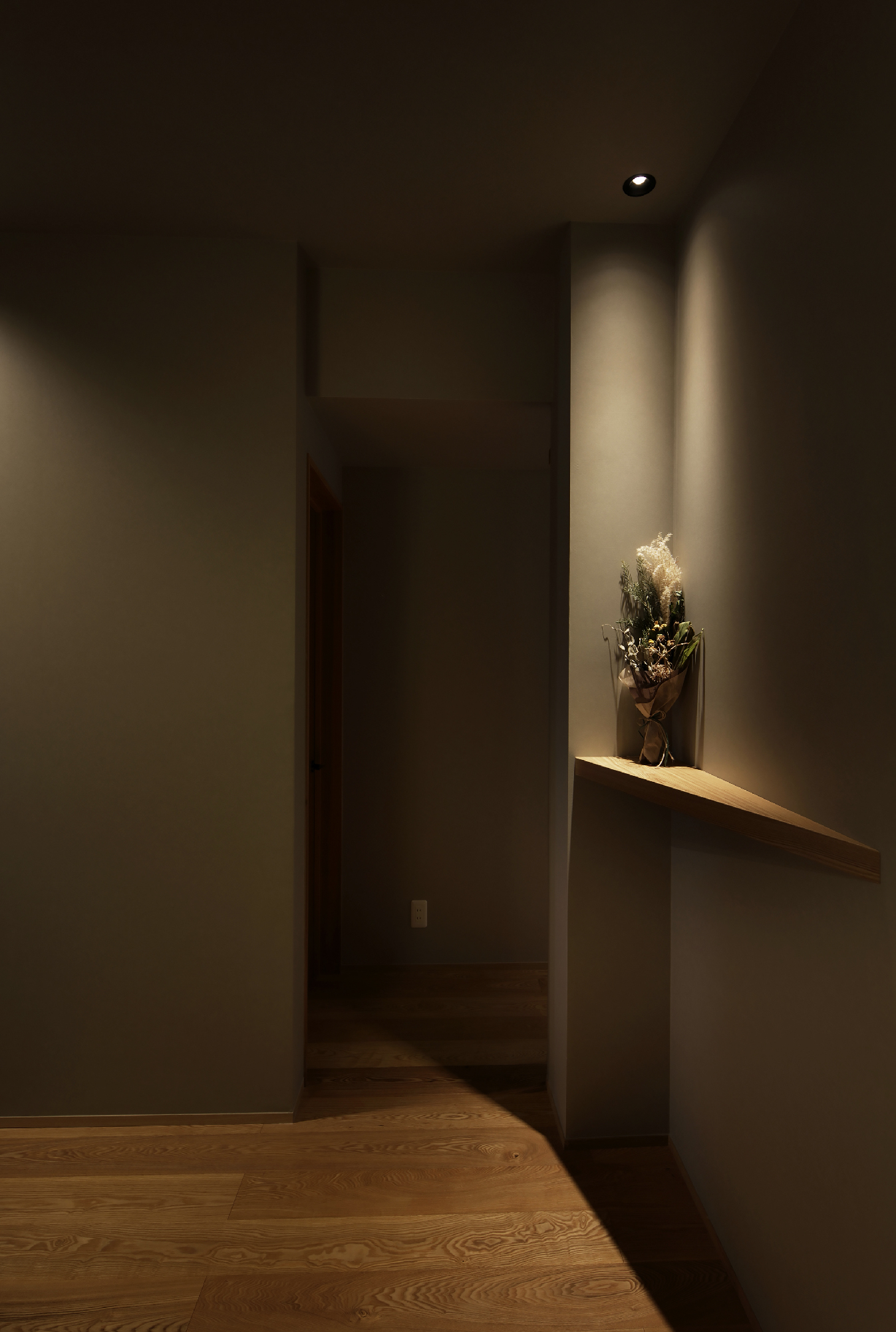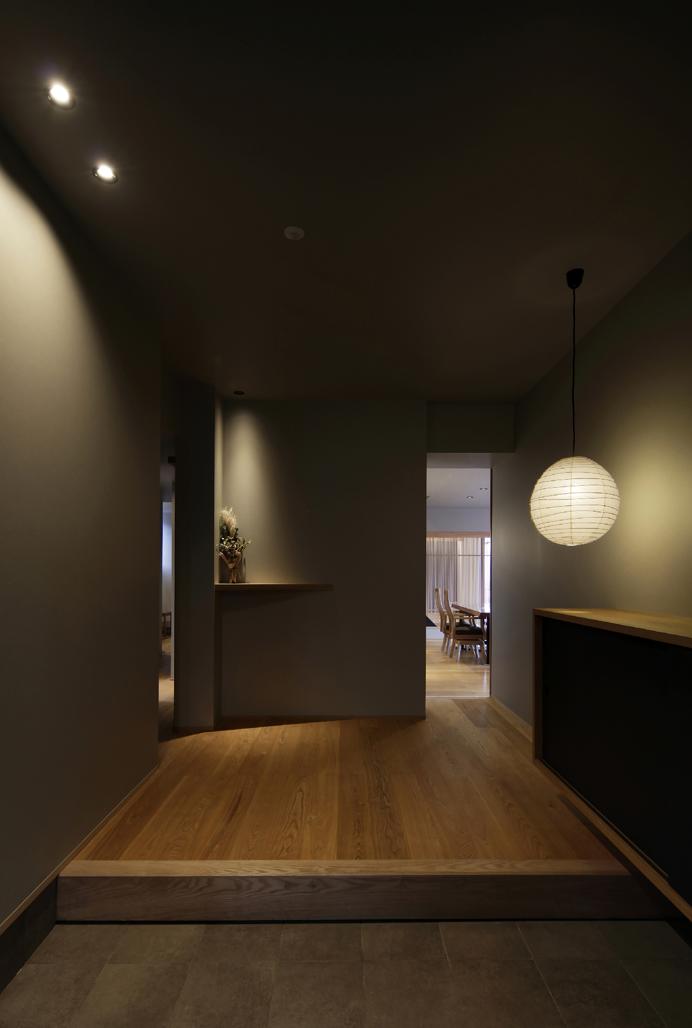 20年前に建てた自宅が手狭になったご夫婦と成人した娘3人のための2軒目の住まいである。 敷地は1軒目の家から徒歩30秒ほどの閑静な住宅街で、道路より3メートル高い位置にある。 子育てを終えたご夫婦に、これからはゆとりある時間を過ごしてほしいと感じた。 外観はご主人の要望である「大きな屋根」を持つ、どっしりとした平屋をイメージ。 道路からは2階の存在を感じさせないよう軒を1.5メートル出し、落ち着いた佇まいとした。 玄関は敷地の奥に配置し、約20メートルのアプローチを設けた。 車を降り、庭のもみじを眺めながら軒下を歩く時間が心を整える。 玄関ポーチには木製格子戸を設け、その奥にアルミ製ドアを配置。 完成後は離れて暮らす娘さんたちも週末に帰省し、再びリビングに家族の笑顔が集まっている。 (392文字)