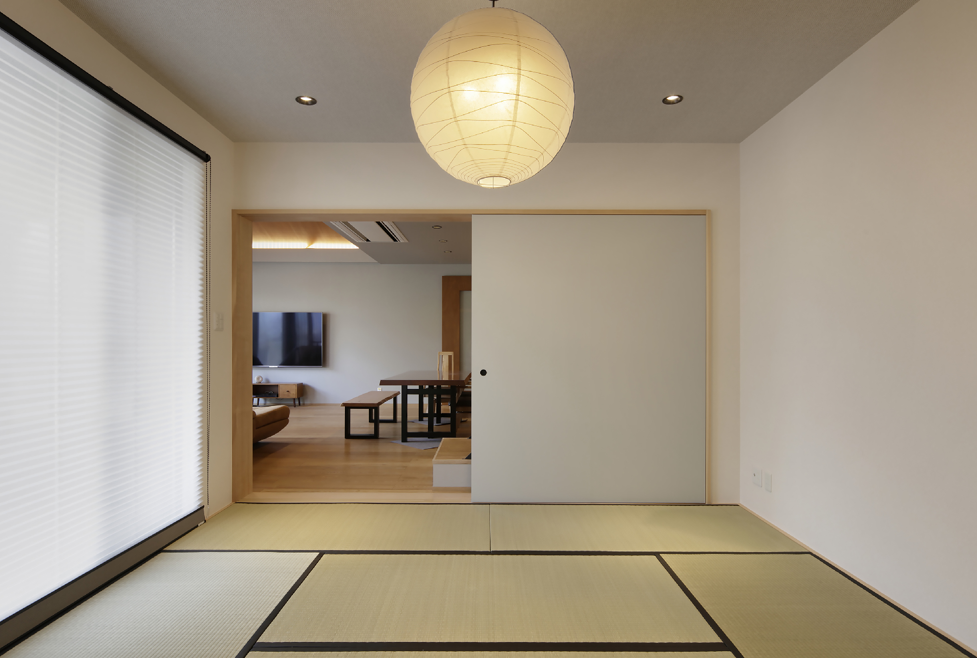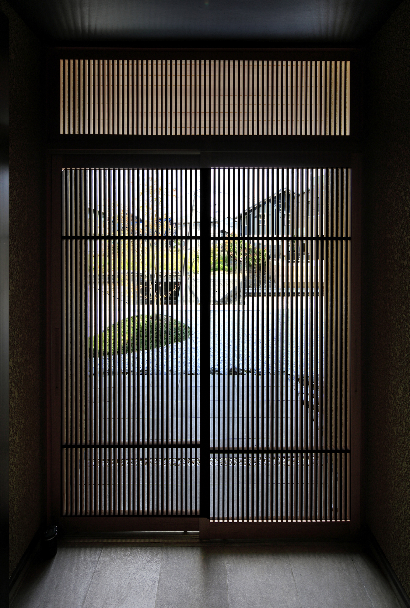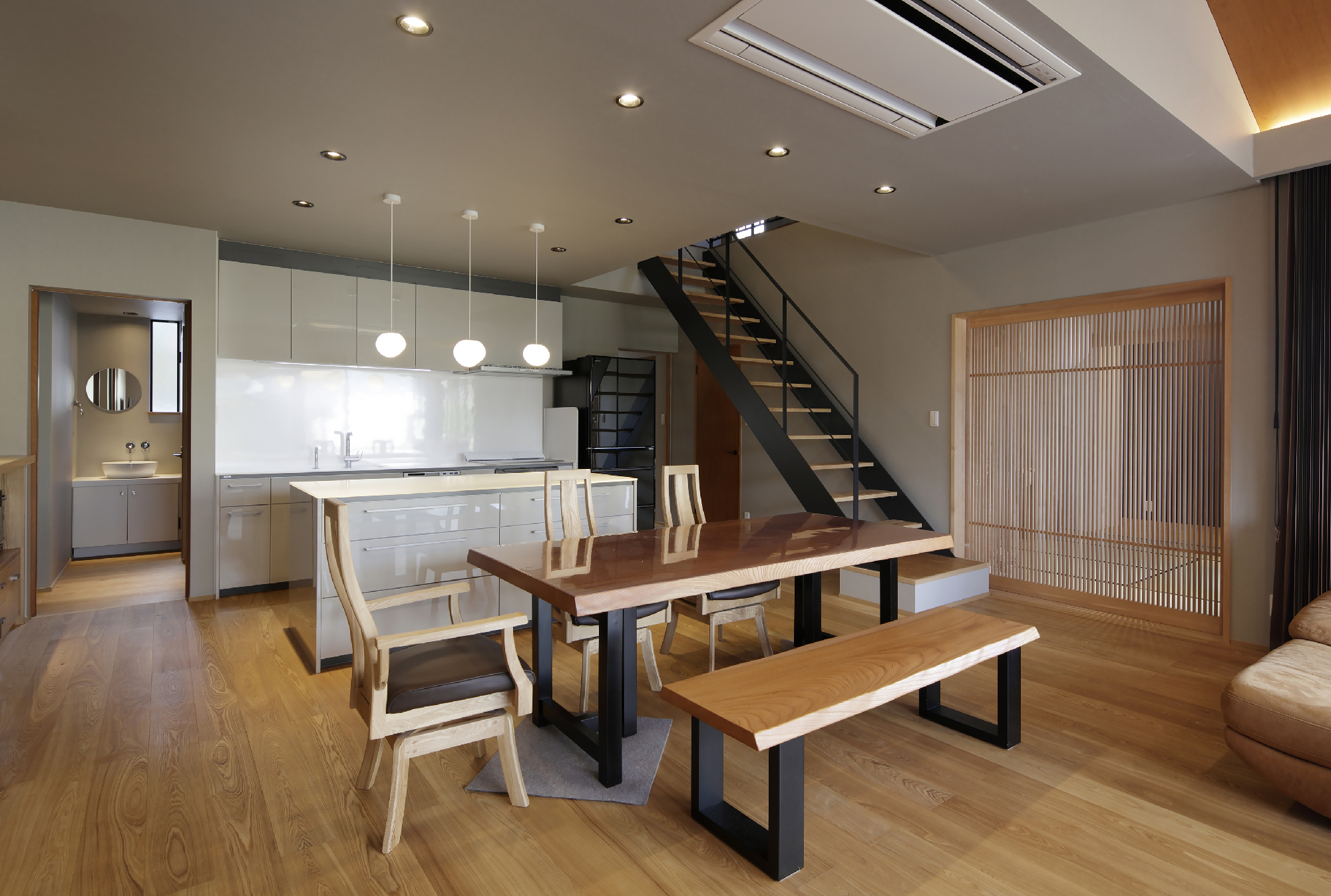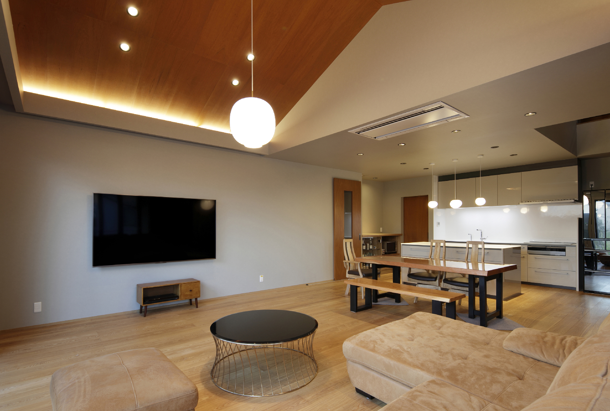 20年前に建てた自宅が手狭になったご夫婦と成人した娘3人のための2軒目の住まいである。 敷地は1軒目の家から徒歩30秒ほどの閑静な住宅街で、道路より3メートル高い位置にある。 子育てを終えたご夫婦に、これからはゆとりある時間を過ごしてほしいと感じた。 外観はご主人の要望である「大きな屋根」を持つ、どっしりとした平屋をイメージ。 道路からは2階の存在を感じさせないよう軒を1.5メートル出し、落ち着いた佇まいとした。 玄関は敷地の奥に配置し、約20メートルのアプローチを設けた。 車を降り、庭のもみじを眺めながら軒下を歩く時間が心を整える。 玄関ポーチには木製格子戸を設け、その奥にアルミ製ドアを配置。 完成後は離れて暮らす娘さんたちも週末に帰省し、再びリビングに家族の笑顔が集まっている。 (392文字)