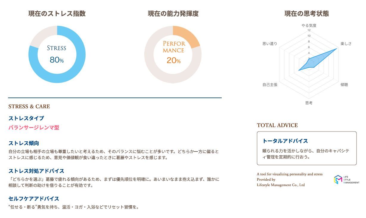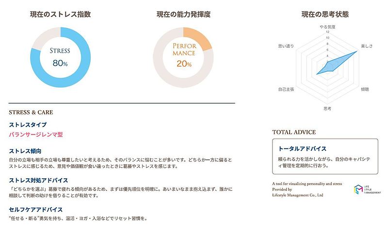 診断にはストレスタイプ・対処法・セルフケアのアドバイスまで含まれ、厚労省のストレスチェック制度の定性的補完としても導入実績あり。