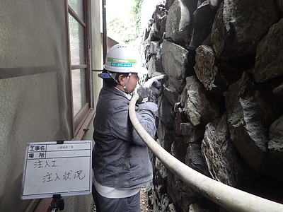 増築工事によって石積みのすぐ横まで家屋が迫っている場所等では既存の補強方法では施工ができません。