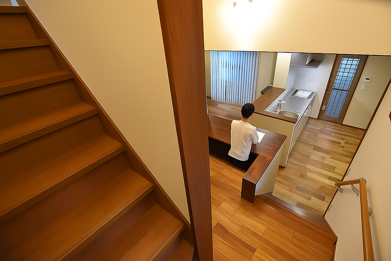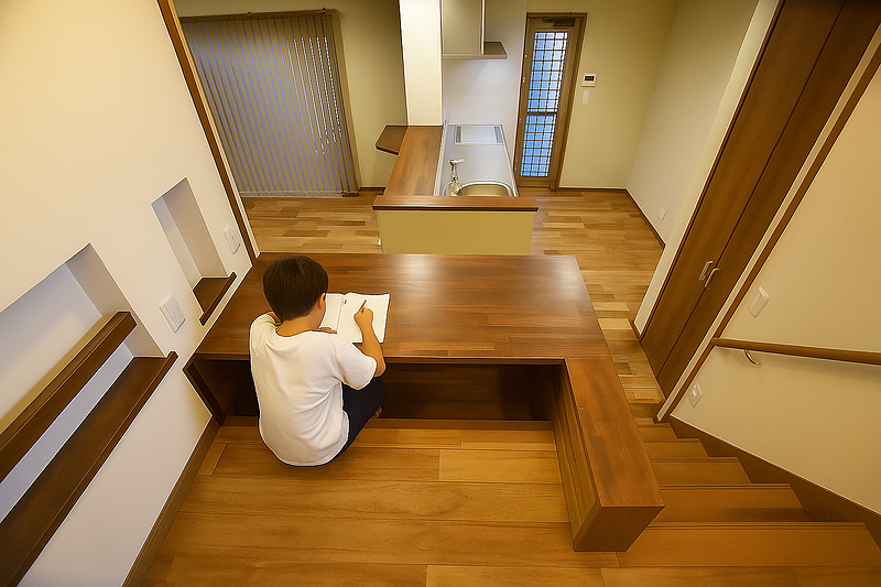 ◆小学生のお子様が、中二階スペースの座卓(足が入る作り付けカウンター)で宿題をされている様子を、家事の合間に見れます。(リビング学習は、効果があると聞きます。)