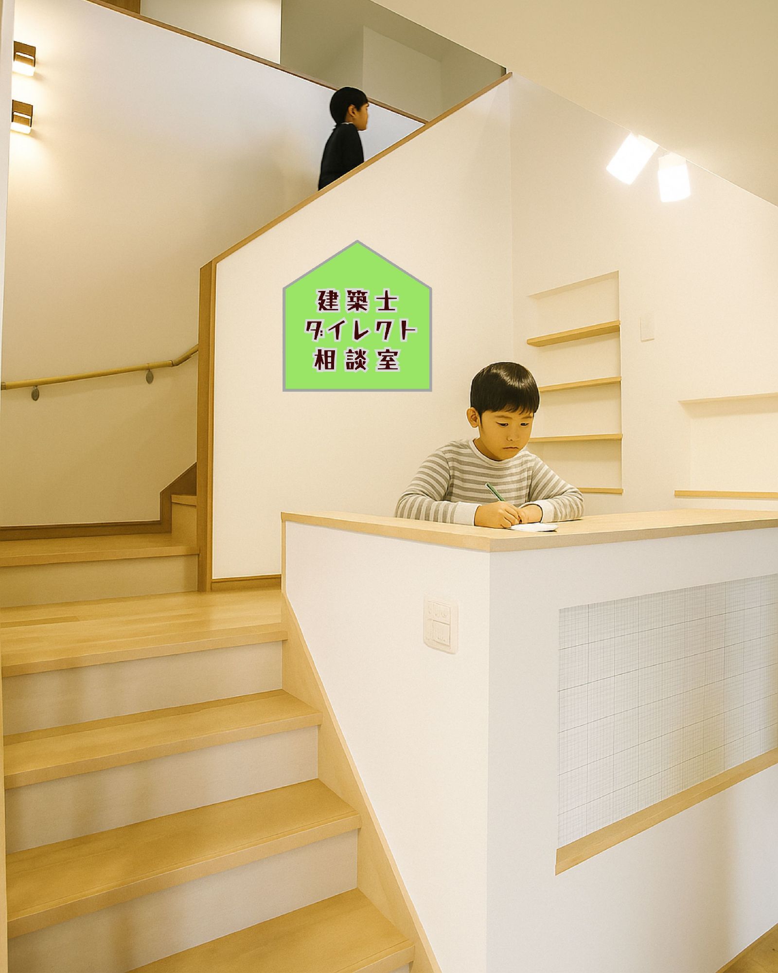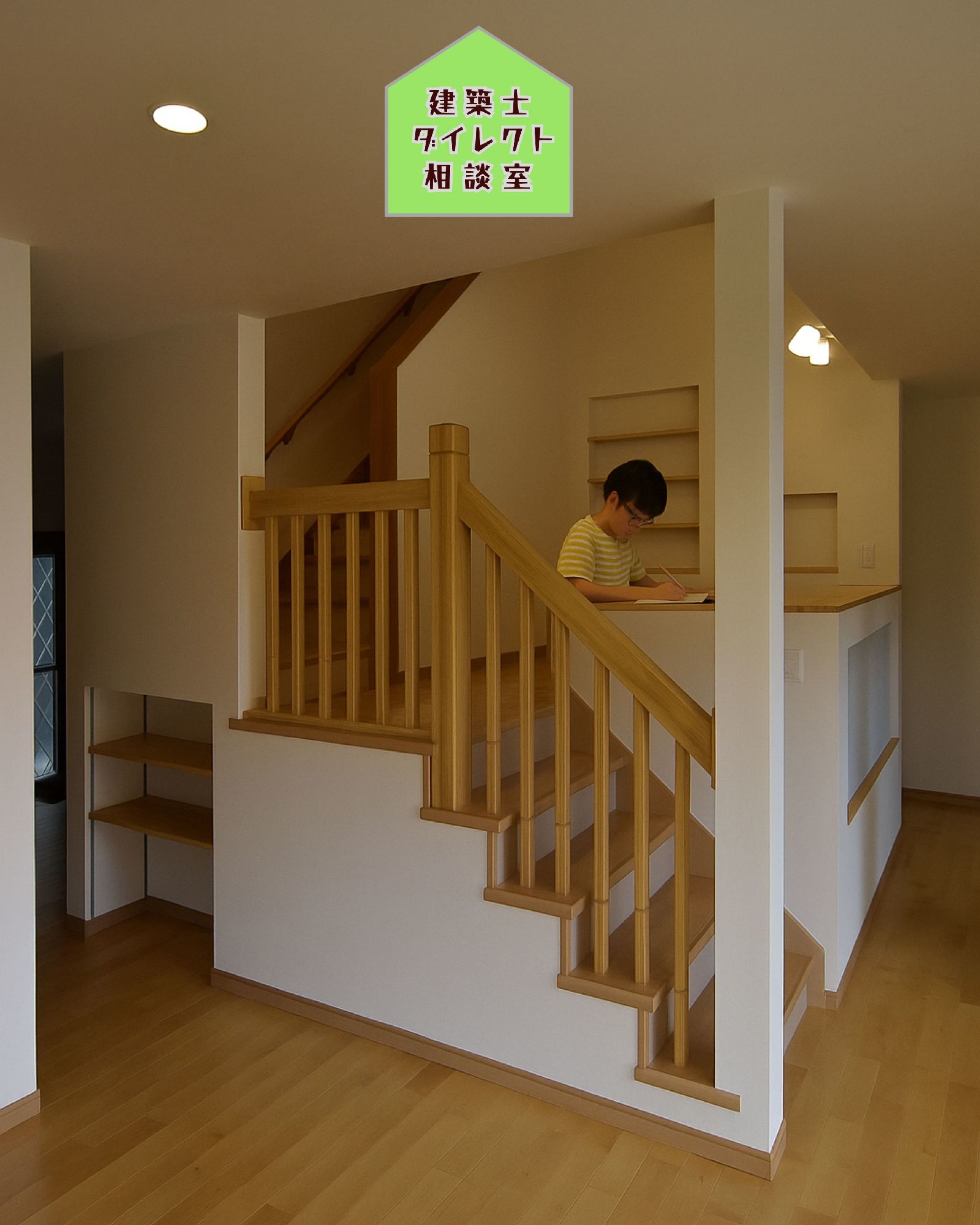 階段を5段上がった先にある「2帖の踊り場」には、足を伸ばせるカウンター付きの机があります。