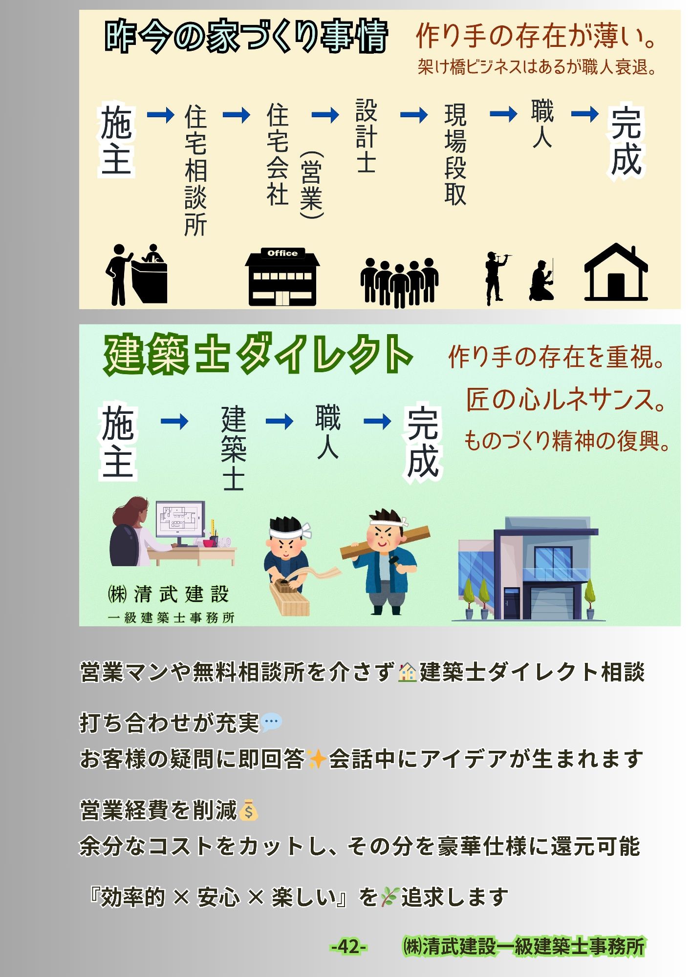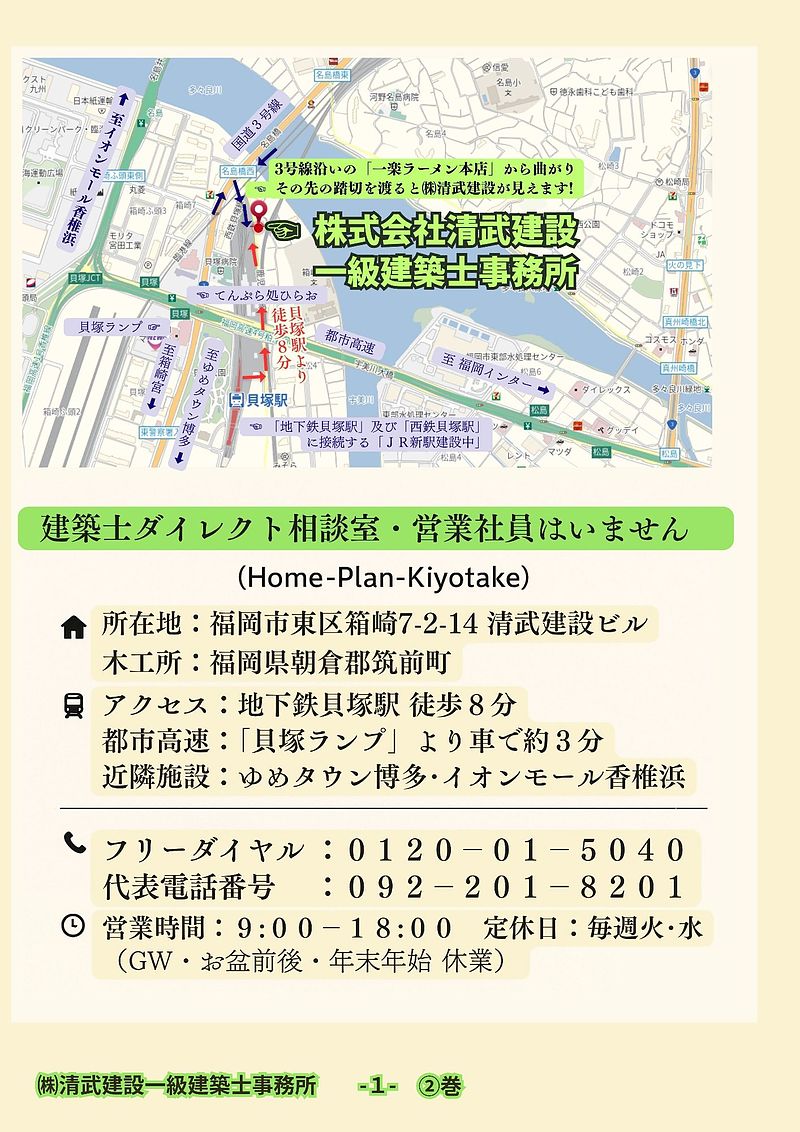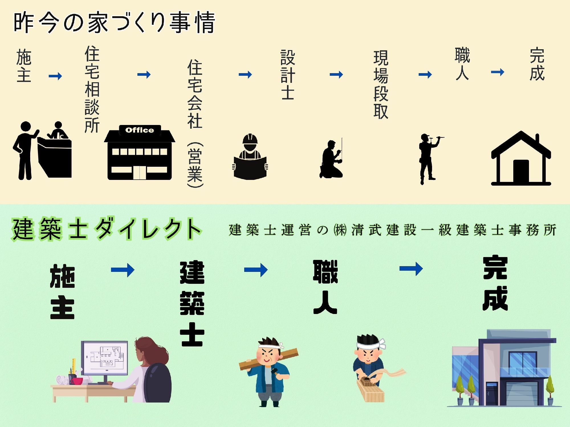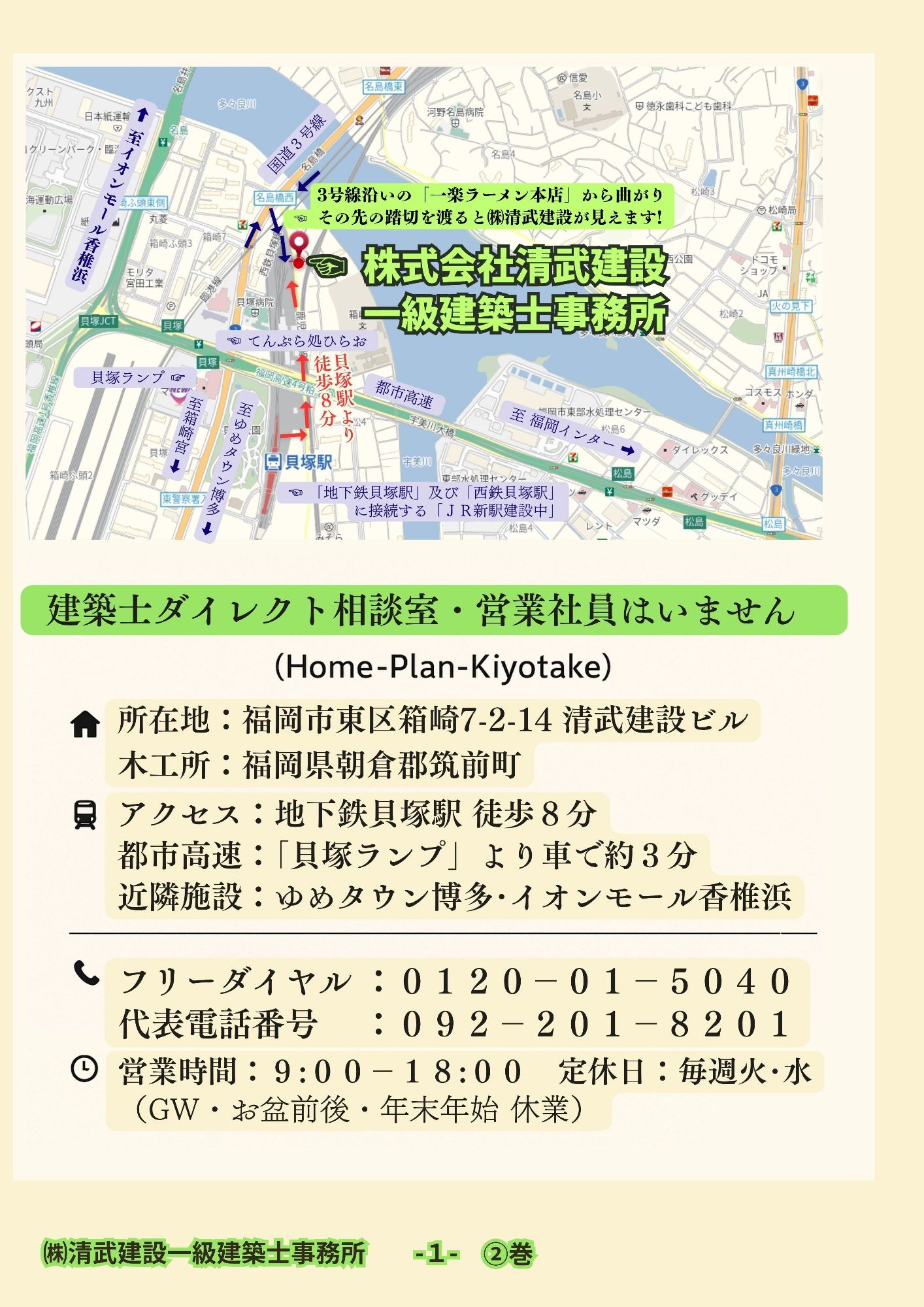 1級建築士(清武修一)+2級建築士(社員)のみで運営。ご予算を把握した設計図を作成し、弊社で建築工事。
