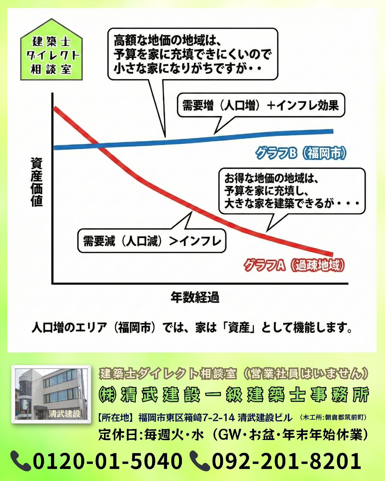 「特に、人口が増え続ける『福岡市』エリアは、資産価値が落ちにくいです。」