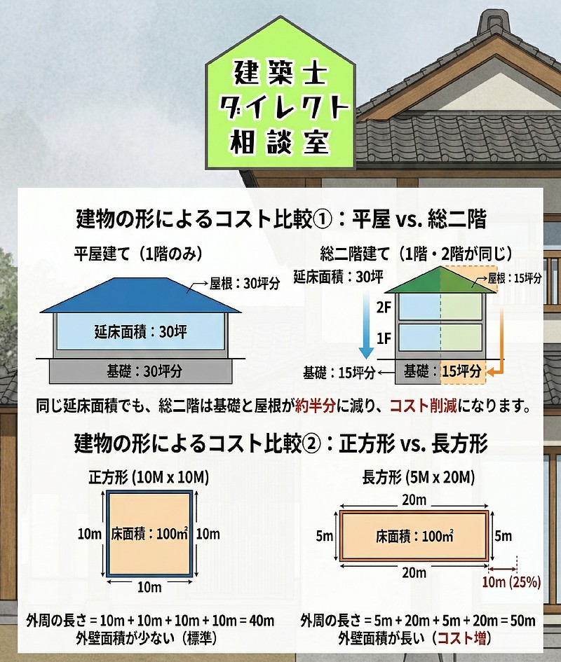 上記図のように、家の形からコストが下がります。