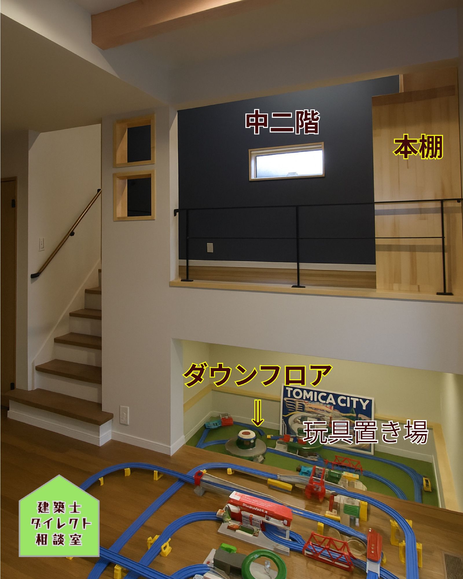 ・スキップフロア下部は、お子様が遊ぶ玩具を広げてもLDKには散からないイメージで、LDK床面より30cm下がるダウンフロアがあります。(グリーンカラーの床がダウンフロアです。) ・1階より6段上がったところに『スキップフロア』があります。『スキップフロア』はアイアンの手摺で仕切られ、作り付けの本棚を設置しています。 ・キッチンより、『スキップフロア』及び『ダウンフロア』が視界に入るレイアウトにしており、家族みんなの距離が近くなることを意図しています。 ・2階廊下より『スキップフロア』を見下ろせます。2階より1階の『LDK』の気配を感じることができます。1階と2階部分が分断されず、連続性があり、住居スペース全体に一体的な開放性を生む仕組みの『スキップフロア』です。