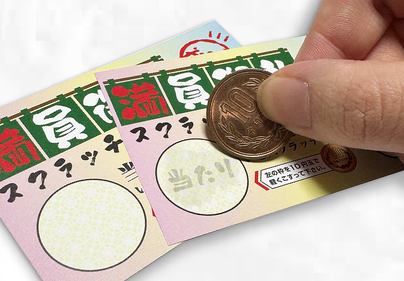 ※スクラッチ部分については、こする前は淡い黄色で、10円硬貨などでこすると薄いグレーで文字が浮き上がる仕組みとなっています。