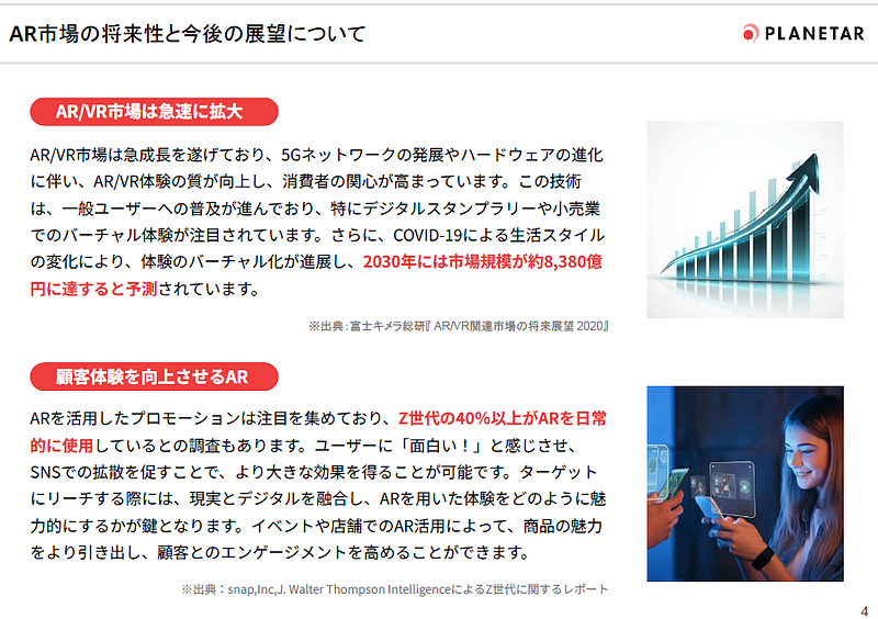 AR/VR市場は急成長を遂げており、5Gネットワークの発展やハードウェアの進化に伴い、AR/VR市体験の質が向上し、消費者の関心が高まっています。この技術は一般ユーザーへの普及が進んでおり、特にデジタルスタンプラリーや小売業でのバーチャル体験が注目されています。2030年には市場規模が約8300億円に達すると予測されています。