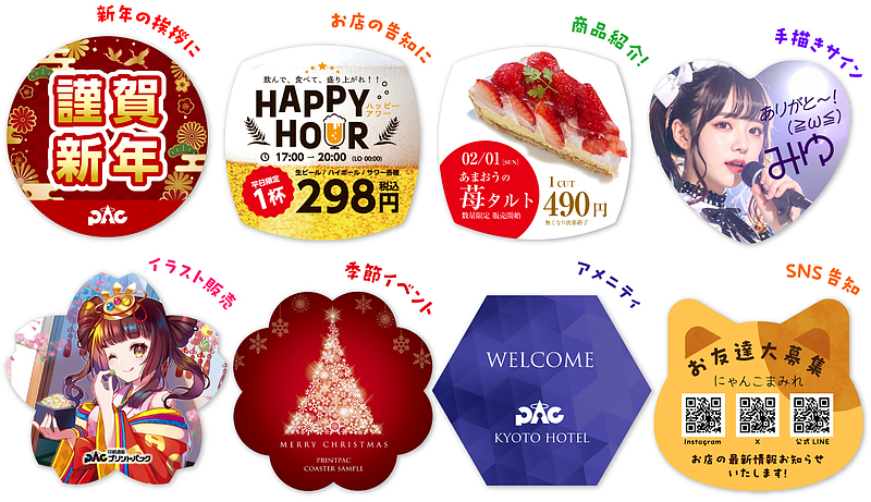 お店のイベント告知・季節限定コースター・イラスト配布・販売などにいかがですか?