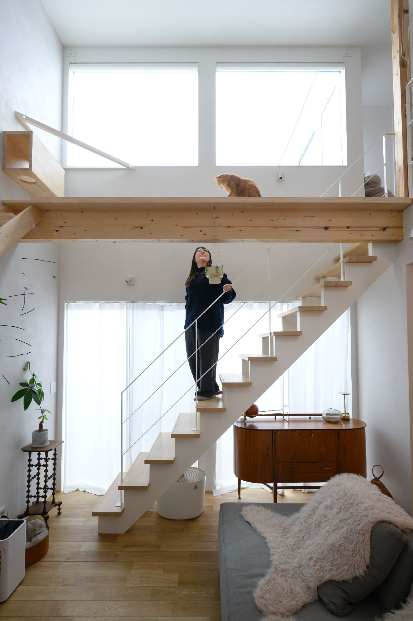 リビングの吹き抜けに沿って設置された、造作キャットウォーク。猫が梁の上を悠々と歩き、キャットドアへと繋がっている。一級建築士が設計した、構造体と一体化したキャットウォーク
