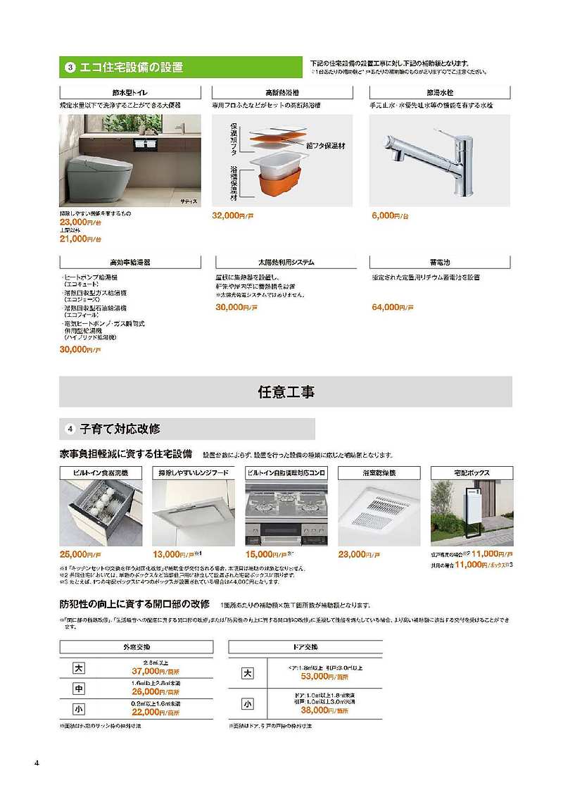 以上の4つからなります。新築住宅とリフォームを対象にした4つの補助事業により、家庭部門の省エネ化の保進します。