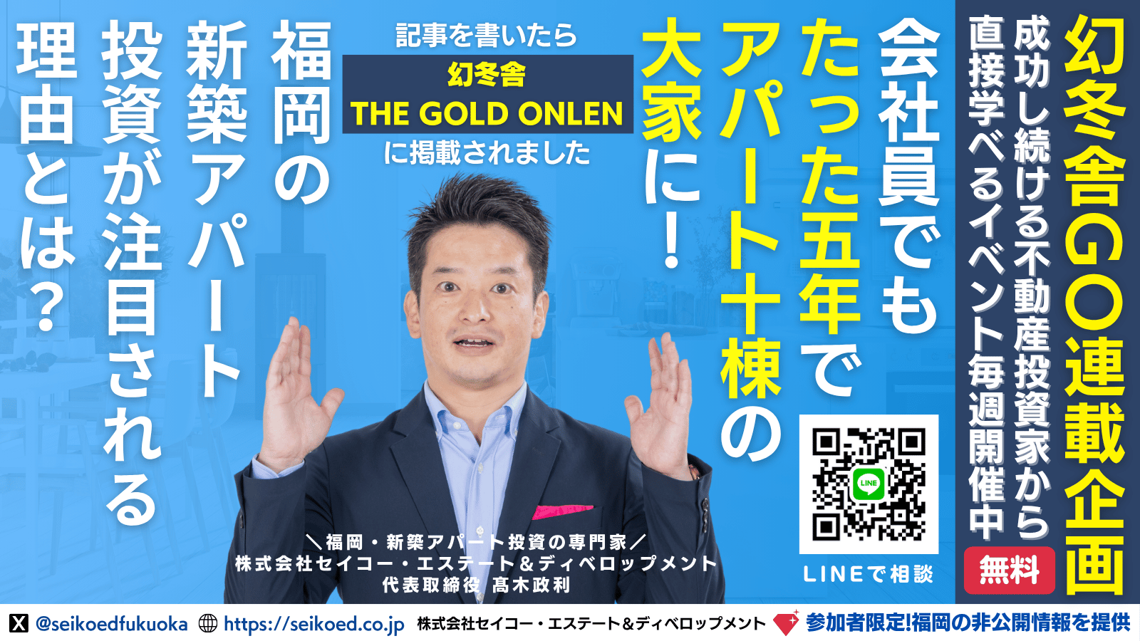 福岡で新築アパート投資を成功させる秘訣を髙木代表が幻冬舎ゴールドオンラインで解説。老後の不安を変える無料セミナーを7/12から開催。会社員・初心者も必見!
