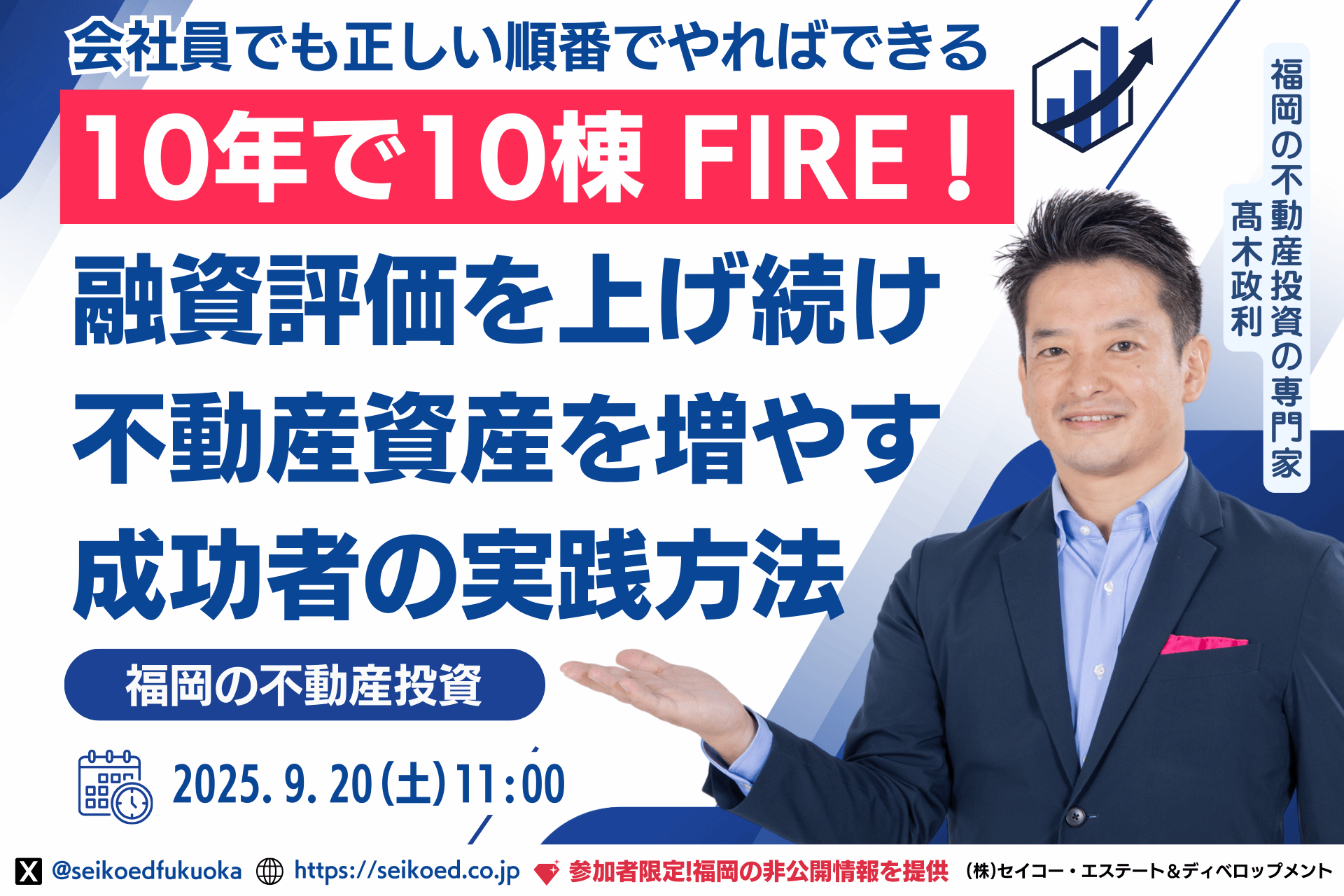 セイコー・エステート&ディベロップメントでは、会社員でも最短で10棟・FIREを目指せる投資戦略セミナーを開催しています。