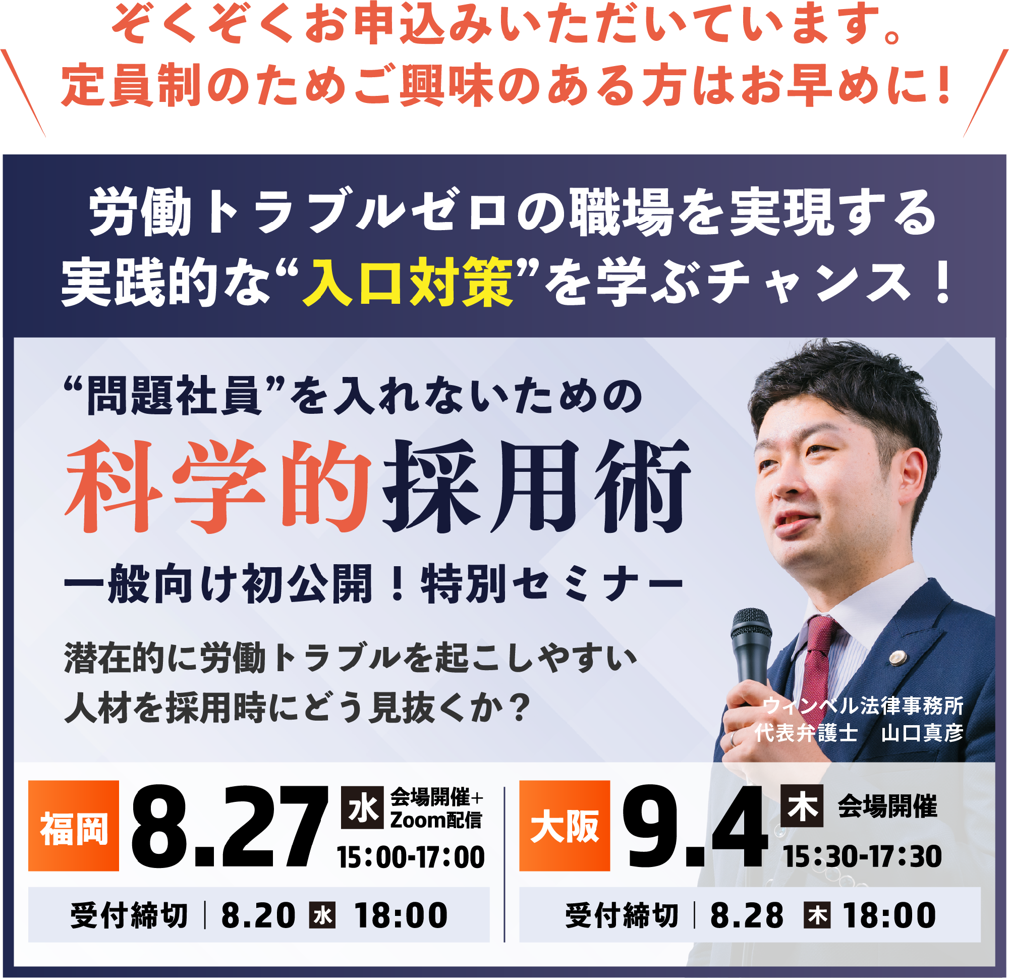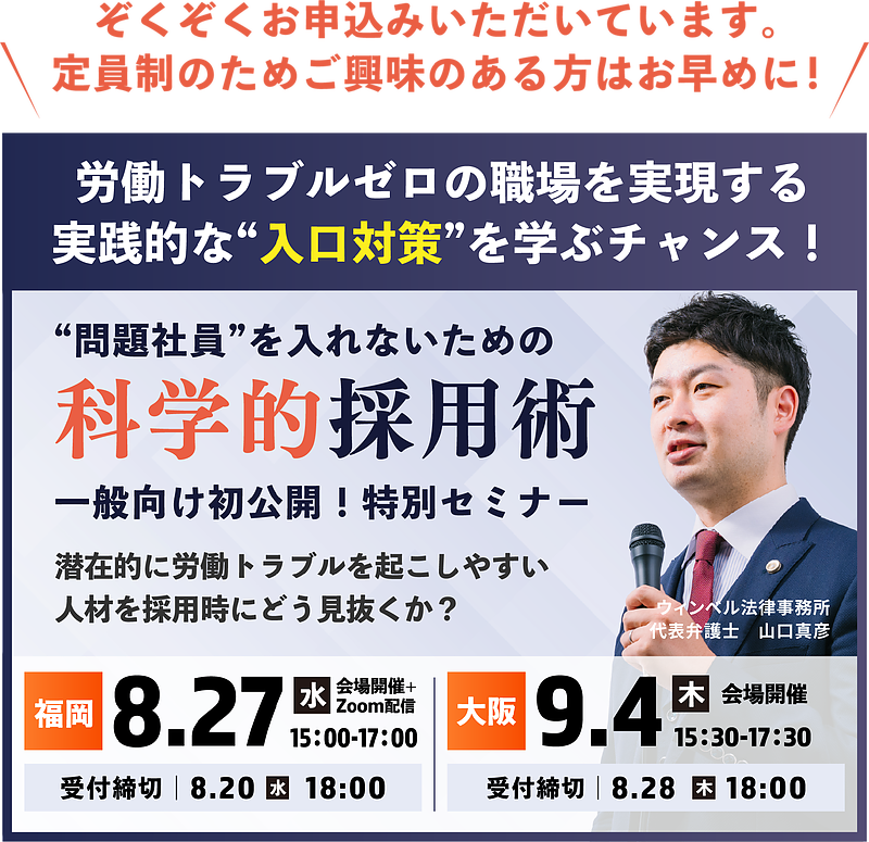 2025年7月29日、PR TIMESにて、当事務所主催のセミナーに関するプレスリリース『問題社員を辞めさせたい時はどうする?採用経験者92%が経験!科学的採用術の福岡セミナー開催が決定』が掲載されました。