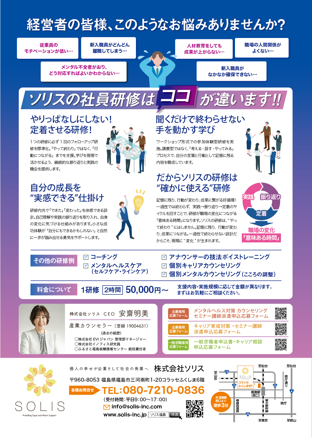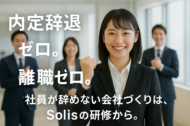 大きな特徴は、必ず『フォローアップ研修』を実施し、学びを行動につなげる点です。新卒からベテランまで一貫した育成を行うことで、定着率が上がり、組織全体の活力がよみがえります。人材不足を補う最も確実な方法は「辞めない仕組み」を作ること。Solisは人事担当者様と伴走し、内定辞退ゼロ・離職ゼロの組織づくりをサポートします。