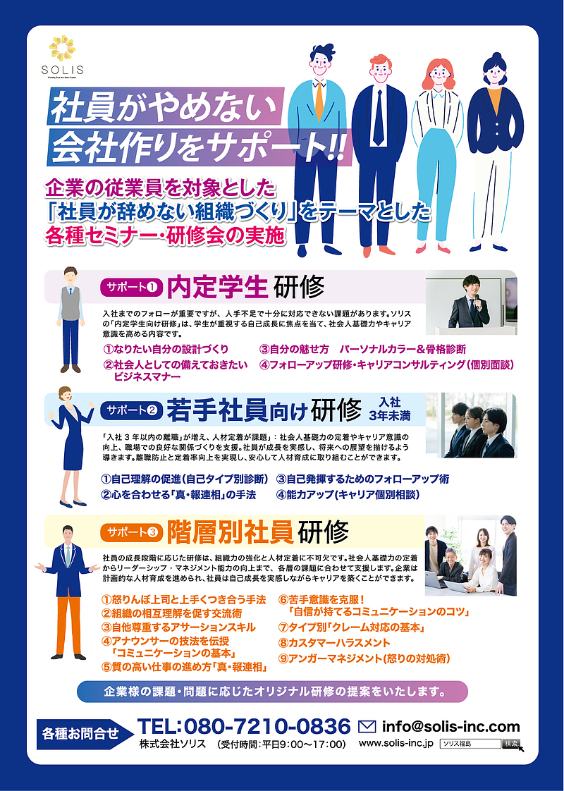 Solisの研修は、新卒内定者に対しては「社会人になる準備」と「会社に期待を持てる仕掛け」を組み込み、不安を解消し入社意欲を高めます。また、既存社員に向けても、コミュニケーション改善やキャリア意識の醸成、「辞めない人材」を育成します。