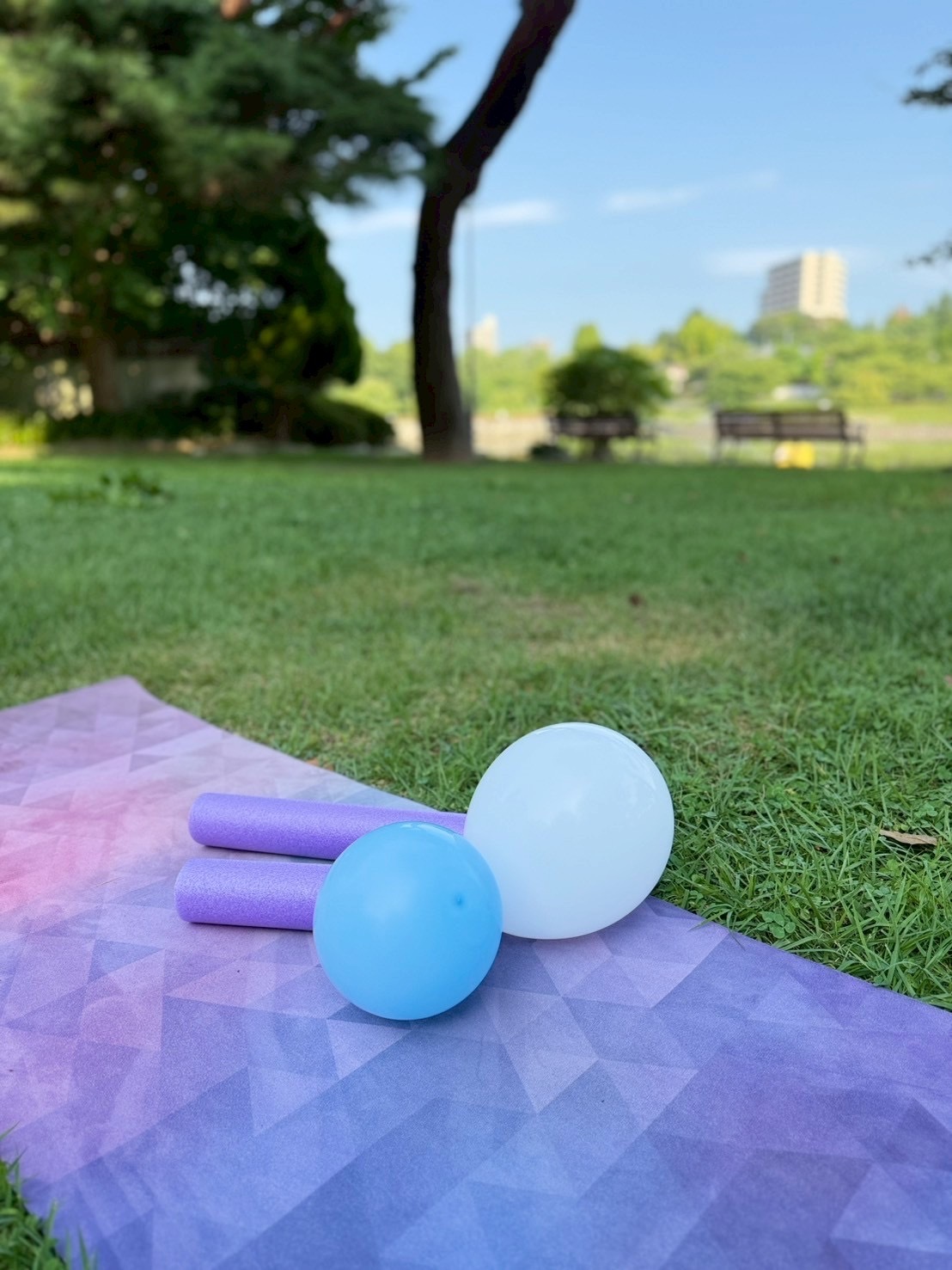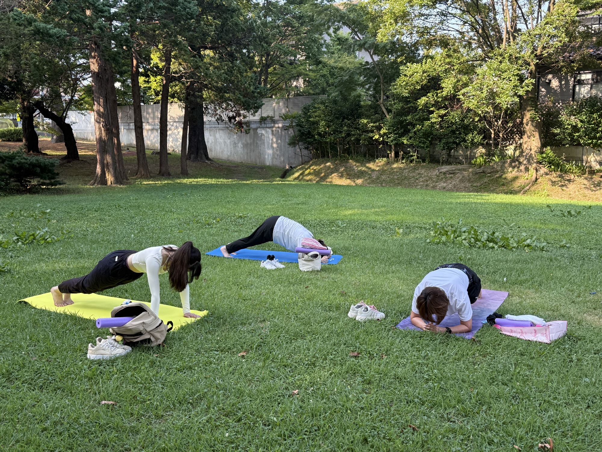 荒池公園でのモーニングヨガ講座の風景 朝の澄んだ空気、草の香り、鳥の鳴き声、を感じながら体を動かします。 ヨガのポーズができなくてもOK!呼吸と軸を整えながら、自分に向き合っていきます。