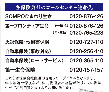 お問い合わせは保険パートナーまたは下記の各保険会社コールセンターまでお問合せくださいませ