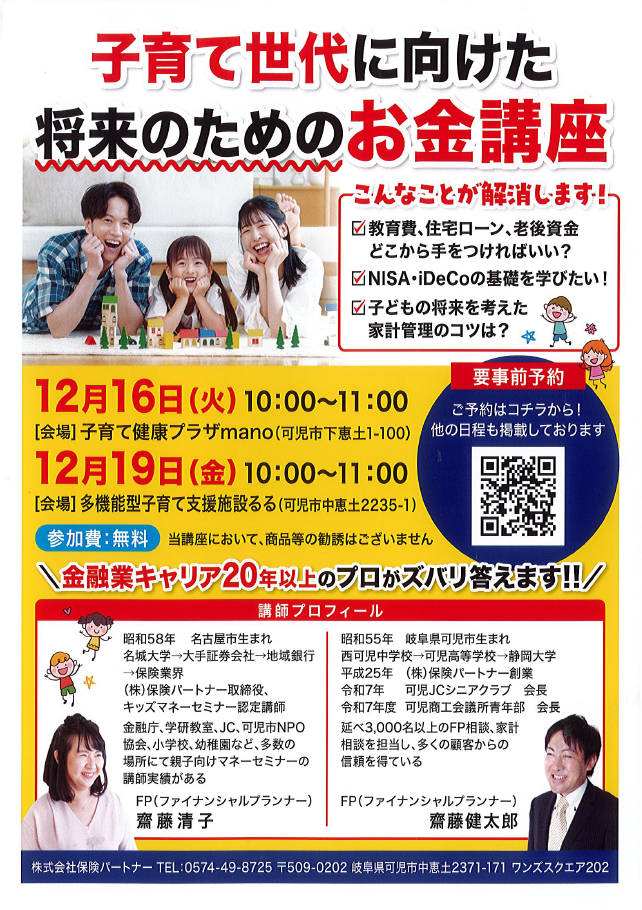 教育費、住宅ローン、老後資金...「将来のお金、どうしたらいい?」そんな不安はありませんか?この講座では、金融業界キャリア20年以上のプロFPが、子育て世代のお金の悩みにズバリお答えします!