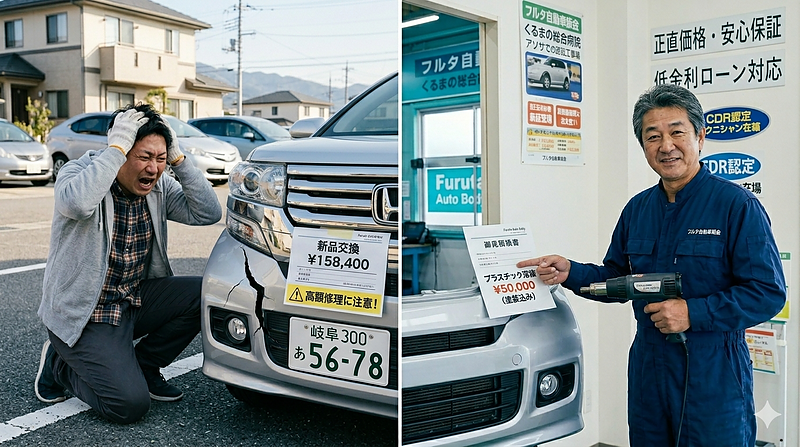 今回は、なぜ他店では「交換」と言われるのかという業界の裏側と、フルタ自動車鈑金が誇る独自の技術「プラスチック溶接」、そしてコストを抑えて完璧に復活させるプロセスについて、徹底解説します。