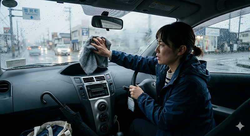 雨の日にガラスが曇って前が見えなくなり、慌ててダッシュボードに入っていたタオルや素手で拭き取ってしまう。お気持ちは非常によく分かります。しかし、これには恐ろしい落とし穴があります。