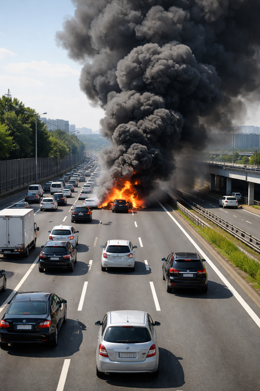 高速道路での車両火災は、一般道とは比べ物にならないほど危険です。火災そのものの恐怖に加え、時速100kmで突っ込んでくる後続車による「二次事故(追突)」のリスクが非常に高いためです。