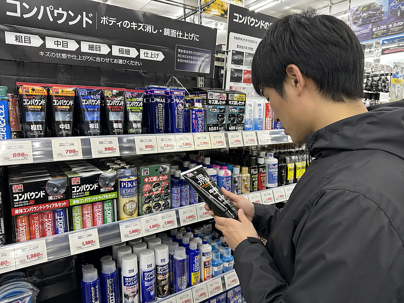 カー用品店の棚の前で、どのコンパウンドを買おうかスマホで検索しているあなた。