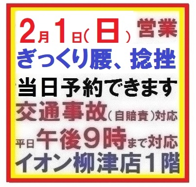 2月1日(日曜日)営業いたします 休業中も、交通事故での治療、手続きの仕方、寝違い、捻挫など応急処置の方法など、LINEにてお気軽にご相談ください。