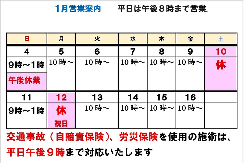 1月11日(日曜日)営業いたします 午前9時~1時まで営業いたします 午後は休業いたします。日曜日の予約できます。 岐阜市、笠松町、羽島市 、整体、骨盤矯正!!