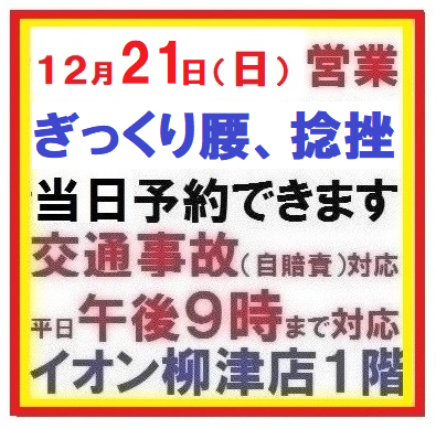 12月21日(日曜日)営業いたします 午前9時~12時まで営業いたします 午後は休業いたします。日曜日の予約できます。 岐阜市の接骨院 笠松町、羽島市からも近い!!