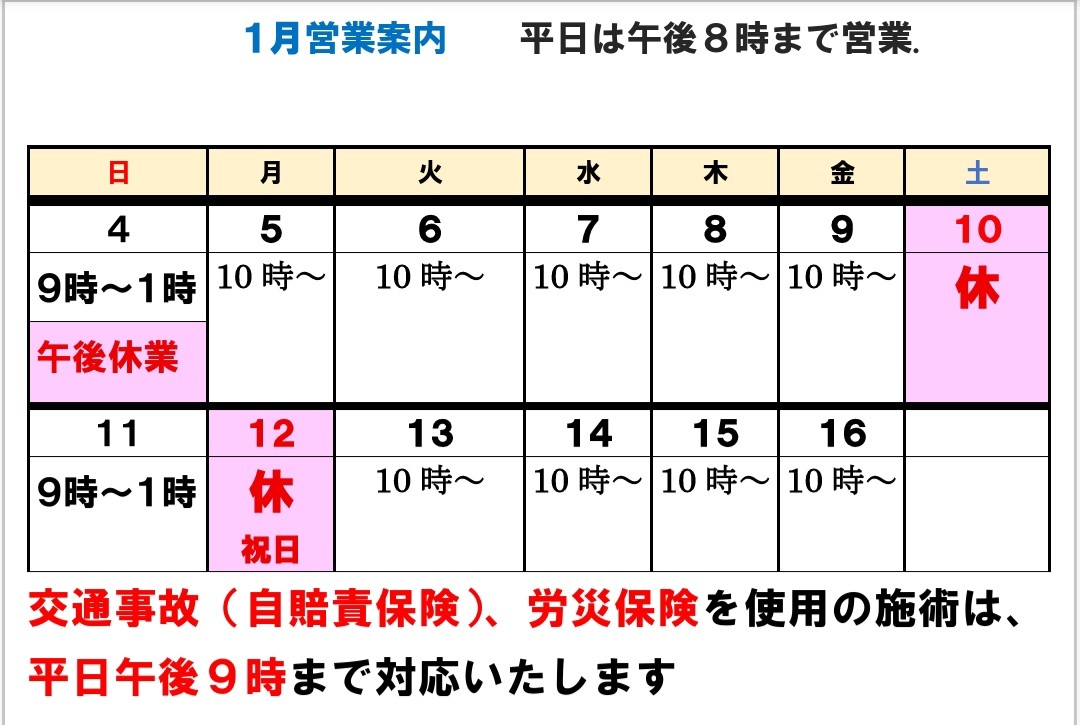 1月11日(日曜日)営業いたします 午前9時~1時まで営業いたします 午後は休業いたします。日曜日の予約できます。 岐阜市、笠松町、羽島市 、整体、骨盤矯正!!