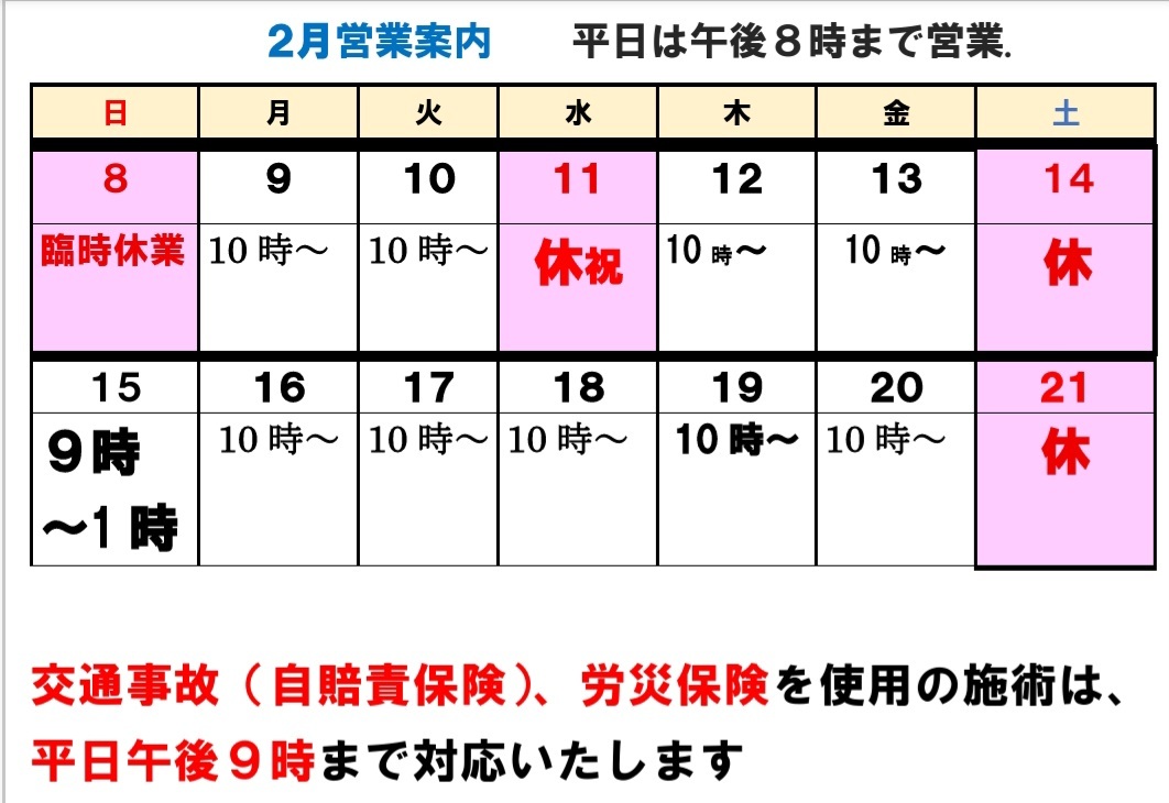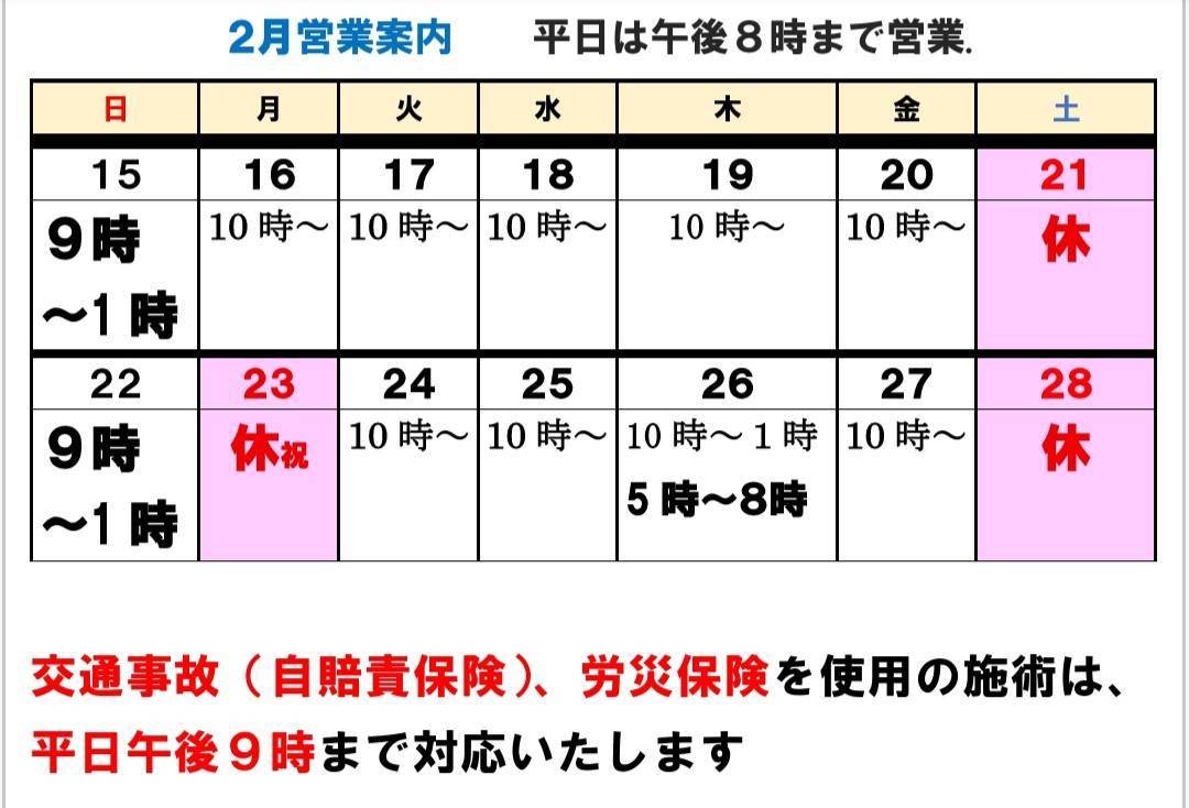 2月22日(日曜日)営業いたします 休業中も、交通事故での治療、手続きの仕方、寝違い、捻挫など応急処置の方法など、LINEにてお気軽にご相談ください