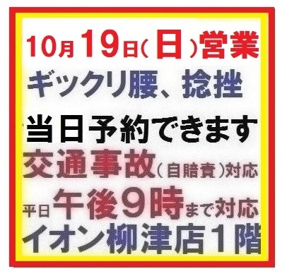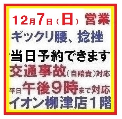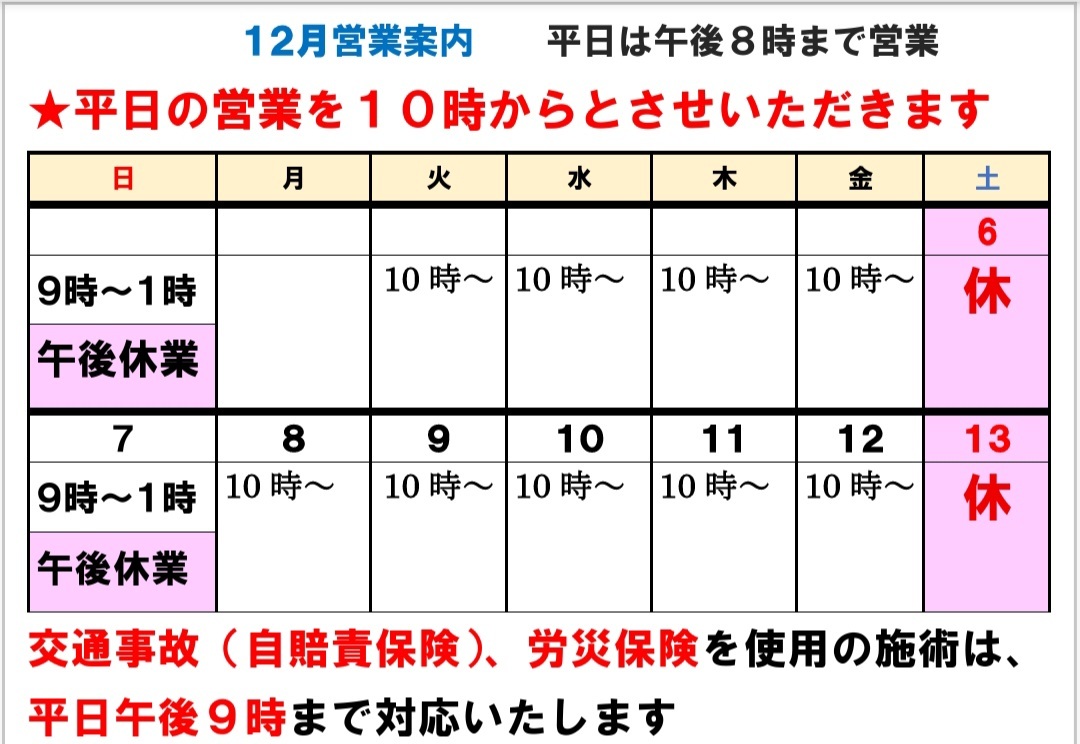 12月7日(日曜日)営業いたします 午前9時~午後1時まで営業いたします。。午後は休業いたします。日曜日の予約できます。 休業中もLINEにて、交通事故治療、捻挫、寝違いなどお問合せ、ご相談ください。